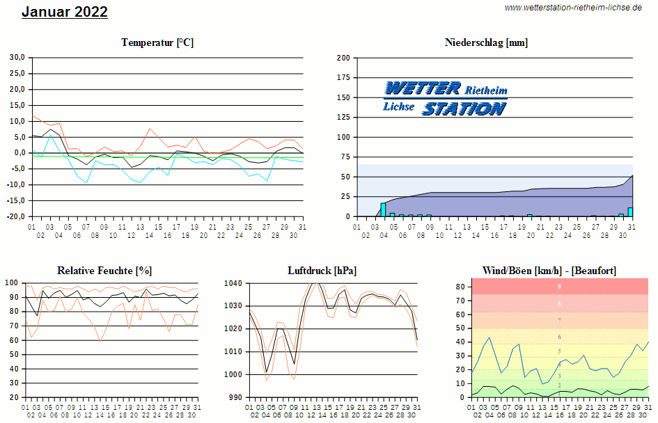 *************************************************** ************** T E M P E R A T U R ************** *************************************************** Mittlere Temperatur: -0,2 °C MIN Temperatur: -9,4 °C am 07.01.22 MAX Temperatur: 11,8 °C am 01.01.22 Mittlere MIN Temperatur: -3,6 °C Mittlere MAX Temperatur: 3,1 °C MIN Temp Delta : 2,0 K am 22.01.22 MAX Temp Delta : 13,5 K am 14.01.22 Mittl. Temp Delta: 6,7 K Starkfrosttage : 0 Eistage : 3 Frosttage : 28 Sommertage : 0 Heiße Tage : 0 *************************************************** ************ N I E D E R S C H L A G ************ *************************************************** Ges. Niederschlagsmenge: 52,2 mm MAX Niederschlag/Stunde: 2,0 mm am 04.01.22 MAX Niederschlag/Tag: 17,4 mm am 04.01.22 MAX Niederschlag in 24h: 18,4 mm am 05.01.22 MAX Niederschlag Rate: 8,0 mm/h am 04.01.22 Niederschlag an 16 Tagen Regentage (> 1mm) : 10 Regentage (> 3mm) : 4 Regentage (> 10mm) : 2 Regentage (> 20mm) : 0 *************************************************** ******************** W I N D ******************** *************************************************** Mittlere Windgeschwindigkeit: 1,2 m/s = 4,5 km/h Effektive Windrichtung: WSW Maximale Windgeschwindigkeit: 12,1 m/s = 43,5 km/h aus S am 04.01.22 Prozentuale Verteilung Windgeschwindigkeit: Bft_0 (bis 0,9 km/h) : 19.35 % Bft_1 (bis 5,6 km/h) : 43.54 % Bft_2 (bis 12 km/h) : 34.46 % Bft_3 (bis 20 km/h) : 2.63 % Bft_4 (bis 29 km/h) : 0.01 % Prozentuale Verteilung Windrichtung: N : 5.1 % NNO : 1.7 % NO : 1.1 % ONO : 0.7 % O : 1.3 % OSO : 5.6 % SO : 3.0 % SSO : 0.9 % S : 3.8 % SSW : 23.4 % SW : 13.1 % WSW : 12.9 % W : 7.2 % WNW : 6.4 % NW : 6.1 % NNW : 7.9 % *************************************************** *************** L U F T D R U C K *************** *************************************************** Mittlerer Luftdruck: 1026,9 hPa MIN Luftdruck: 997,4 hPa am 04.01.22 MAX Luftdruck: 1043,7 hPa am 13.01.22 *************************************************** ************ L U F T F E U C H T E ************** *************************************************** Mittlere rel. Luftfeuchte: 90,0 % MIN rel. Luftfeuchte: 59,0 % am 14.01.22 MAX rel. Luftfeuchte: 98,0 %