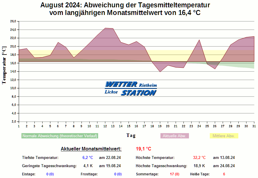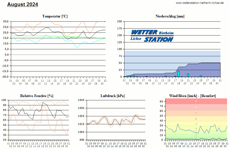 *************************************************** ************** T E M P E R A T U R ************** *************************************************** Mittlere Temperatur: 19,1 °C MIN Temperatur: 6,2 °C am 22.08.24 MAX Temperatur: 32,2 °C am 13.08.24 Mittlere MIN Temperatur: 13,0 °C Mittlere MAX Temperatur: 25,5 °C MIN Temp Delta : 4,1 K am 19.08.24 MAX Temp Delta : 18,9 K am 24.08.24 Mittl. Temp Delta: 12,5 K Starkfrosttage : 0 Eistage : 0 Frosttage : 0 Sommertage : 17 Heiße Tage : 6 *************************************************** ************ N I E D E R S C H L A G ************ *************************************************** Ges. Niederschlagsmenge: 51,2 mm MAX Niederschlag/Stunde: 6,4 mm am 21.08.24 MAX Niederschlag/Tag: 20,0 mm am 18.08.24 MAX Niederschlag in 24h: 20,0 mm am 18.08.24 MAX Niederschlag Rate: 106,6 mm/h am 21.08.24 Niederschlag an 12 Tagen Regentage (> 1mm) : 8 Regentage (> 3mm) : 5 Regentage (> 10mm) : 2 Regentage (> 20mm) : 0 *************************************************** ******************** W I N D ******************** *************************************************** Mittlere Windgeschwindigkeit: 0,6 m/s = 2,2 km/h Effektive Windrichtung: NNO Maximale Windgeschwindigkeit: 9,4 m/s = 33,8 km/h aus S am 07.08.24 Prozentuale Verteilung Windgeschwindigkeit: Bft_0 (bis 0,9 km/h) : 43.79 % Bft_1 (bis 5,6 km/h) : 45.27 % Bft_2 (bis 12 km/h) : 10.61 % Bft_3 (bis 20 km/h) : 0.32 % Prozentuale Verteilung Windrichtung: N : 18.0 % NNO : 4.4 % NO : 5.7 % ONO : 1.8 % O : 4.5 % OSO : 16.6 % SO : 1.4 % SSO : 0.9 % S : 3.7 % SSW : 15.5 % SW : 1.8 % WSW : 1.6 % W : 1.1 % WNW : 4.1 % NW : 4.7 % NNW : 14.3 % *************************************************** *************** L U F T D R U C K *************** *************************************************** Mittlerer Luftdruck: 1014,3 hPa MIN Luftdruck: 1006,1 hPa am 13.08.24 MAX Luftdruck: 1022,2 hPa am 26.08.24 *************************************************** ************ L U F T F E U C H T E ************** *************************************************** Mittlere rel. Luftfeuchte: 77,4 % MIN rel. Luftfeuchte: 31,0 % am 30.08.24 MAX rel. Luftfeuchte: 98,0 %