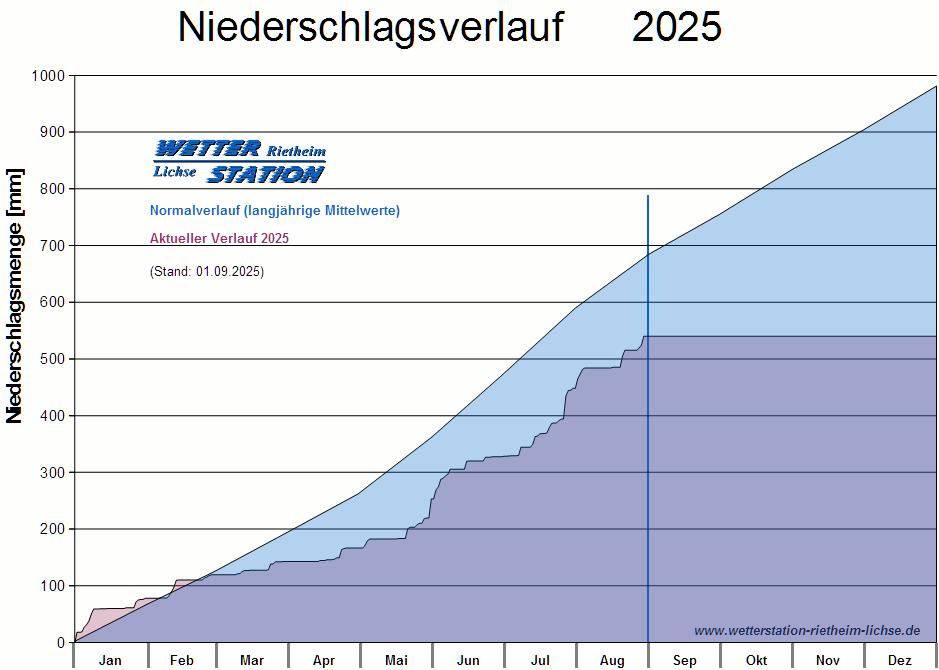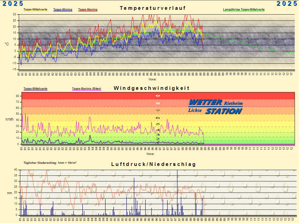 *************************************************** ************** T E M P E R A T U R ************** *************************************************** Mittlere Temperatur: 9,8 °C MIN Temperatur: -11,4 °C am 04.01.25 MAX Temperatur: 32,4 °C am 02.07.25 Mittlere MIN Temperatur: 4,7 °C Mittlere MAX Temperatur: 15,2 °C MIN Temp Delta : 1,0 K am 17.01.25 MAX Temp Delta : 20,0 K am 08.08.25 Mittl. Temp Delta: 10,5 K Starkfrosttage : 1 Eistage : 15 Frosttage : 70 Sommertage : 37 Heiße Tage : 11 *************************************************** ************ N I E D E R S C H L A G ************ *************************************************** Ges. Niederschlagsmenge: 540,0 mm MAX Niederschlag/Stunde: 24,6 mm am 31.05.25 MAX Niederschlag/Tag: 40,4 mm am 27.07.25 MAX Niederschlag in 24h: 40,8 mm am 28.07.25 MAX Niederschlag Rate: 256,0 mm/h am 01.08.25 Niederschlag an 103 Tagen Regentage (> 1mm) : 68 Regentage (> 3mm) : 50 Regentage (> 10mm) : 18 Regentage (> 20mm) : 2 Längste Niederschlagsperiode: 9 Tage vom 31.05.25 bis zum 08.06.25 Längste Trockenperiode: 13 Tage vom 01.04.25 bis zum 13.04.25 *************************************************** ******************** W I N D ******************** *************************************************** Mittlere Windgeschwindigkeit: 0,9 m/s = 3,2 km/h Effektive Windrichtung: OSO Maximale Windgeschwindigkeit: 14,3 m/s = 51,5 km/h aus SSW am 06.01.25 Prozentuale Verteilung Windgeschwindigkeit: Bft_0 (bis 0,9 km/h) : 32,20 % Bft_1 (bis 5,6 km/h) : 47,10 % Bft_2 (bis 12 km/h) : 18,59 % Bft_3 (bis 20 km/h) : 2,04 % Bft_4 (bis 29 km/h) : 0,07 % Prozentuale Verteilung Windrichtung: N : 15,2 % NNO : 3,7 % NO : 4,9 % ONO : 2,6 % O : 3,9 % OSO : 20,9 % SO : 4,0 % SSO : 1,5 % S : 3,6 % SSW : 19,4 % SW : 2,6 % WSW : 2,5 % W : 1,5 % WNW : 3,5 % NW : 3,1 % NNW : 7,1 % *************************************************** *************** L U F T D R U C K *************** *************************************************** Mittlerer Luftdruck: 1016,9 hPa MIN Luftdruck: 994,5 hPa am 13.03.25 MAX Luftdruck: 1041,8 hPa am 13.01.25 Grösster Luftdruck-Anstieg innerhalb 24 Stunden: 21,5 hPa am 10.01.25 Grösster Luftdruck-Abfall innerhalb 24 Stunden: -16,4 hPa am 05.01.25 *************************************************** ************ L U F T F E U C H T E ************** *************************************************** Mittlere rel. Luftfeuchte: 77,8 % MIN rel. Luftfeuchte: 22 % am 05.07.25 MAX rel. Luftfeuchte: 99 %