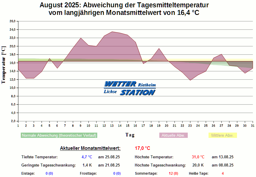 *************************************************** ************** T E M P E R A T U R ************** *************************************************** Mittlere Temperatur: 17,0 °C MIN Temperatur: 4,7 °C am 25.08.25 MAX Temperatur: 31,0 °C am 13.08.25 Mittlere MIN Temperatur: 11,2 °C Mittlere MAX Temperatur: 23,1 °C MIN Temp Delta : 1,4 K am 21.08.25 MAX Temp Delta : 20,0 K am 08.08.25 Mittl. Temp Delta: 11,9 K Starkfrosttage : 0 Eistage : 0 Frosttage : 0 Sommertage : 12 Heiße Tage : 4 *************************************************** ************ N I E D E R S C H L A G ************ *************************************************** Ges. Niederschlagsmenge: 91,8 mm MAX Niederschlag/Stunde: 14,6 mm am 20.08.25 MAX Niederschlag/Tag: 19,8 mm am 20.08.25 MAX Niederschlag in 24h: 26,0 mm am 21.08.25 MAX Niederschlag Rate: 256,0 mm/h am 01.08.25 Niederschlag an 10 Tagen Regentage (> 1mm) : 9 Regentage (> 3mm) : 8 Regentage (> 10mm) : 4 Regentage (> 20mm) : 0 *************************************************** ******************** W I N D ******************** *************************************************** Mittlere Windgeschwindigkeit: 0,6 m/s = 2,2 km/h Effektive Windrichtung: NNW Maximale Windgeschwindigkeit: 8,1 m/s = 29,0 km/h aus SSW am 26.08.25 Prozentuale Verteilung Windgeschwindigkeit: Bft_0 (bis 0,9 km/h) : 38.65 % Bft_1 (bis 5,6 km/h) : 52.91 % Bft_2 (bis 12 km/h) : 8.43 % Prozentuale Verteilung Windrichtung: N : 24.0 % NNO : 4.7 % NO : 4.3 % ONO : 1.6 % O : 4.0 % OSO : 7.6 % SO : 0.8 % SSO : 0.5 % S : 6.7 % SSW : 16.7 % SW : 1.9 % WSW : 1.6 % W : 0.7 % WNW : 5.1 % NW : 4.5 % NNW : 15.3 % *************************************************** *************** L U F T D R U C K *************** *************************************************** Mittlerer Luftdruck: 1015,1 hPa MIN Luftdruck: 1002,8 hPa am 29.08.25 MAX Luftdruck: 1024,0 hPa am 06.08.25 *************************************************** ************ L U F T F E U C H T E ************** *************************************************** Mittlere rel. Luftfeuchte: 77,5 % MIN rel. Luftfeuchte: 33,0 % am 08.08.25 MAX rel. Luftfeuchte: 98,0 %