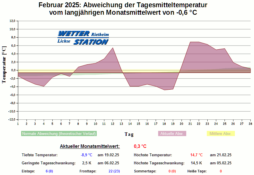 *************************************************** ************** T E M P E R A T U R ************** *************************************************** Mittlere Temperatur: 0,3 °C MIN Temperatur: -8,9 °C am 19.02.25 MAX Temperatur: 14,7 °C am 21.02.25 Mittlere MIN Temperatur: -3,1 °C Mittlere MAX Temperatur: 4,2 °C MIN Temp Delta : 2,5 K am 06.02.25 MAX Temp Delta : 14,5 K am 05.02.25 Mittl. Temp Delta: 7,2 K Starkfrosttage : 0 Eistage : 6 Frosttage : 22 Sommertage : 0 Heiße Tage : 0 *************************************************** ************ N I E D E R S C H L A G ************ *************************************************** Ges. Niederschlagsmenge: 41,6 mm MAX Niederschlag/Stunde: 3,4 mm am 13.02.25 MAX Niederschlag/Tag: 12,4 mm am 13.02.25 MAX Niederschlag in 24h: 15,4 mm am 13.02.25 MAX Niederschlag Rate: 7,8 mm/h am 10.02.25 Niederschlag an 11 Tagen Regentage (> 1mm) : 8 Regentage (> 3mm) : 5 Regentage (> 10mm) : 1 Regentage (> 20mm) : 0 *************************************************** ******************** W I N D ******************** *************************************************** Mittlere Windgeschwindigkeit: 1,0 m/s = 3,6 km/h Effektive Windrichtung: SO Maximale Windgeschwindigkeit: 9,8 m/s = 35,4 km/h aus O am 06.02.25 Prozentuale Verteilung Windgeschwindigkeit: Bft_0 (bis 0,9 km/h) : 30.00 % Bft_1 (bis 5,6 km/h) : 43.58 % Bft_2 (bis 12 km/h) : 24.14 % Bft_3 (bis 20 km/h) : 2.26 % Bft_4 (bis 29 km/h) : 0.02 % Prozentuale Verteilung Windrichtung: N : 5.4 % NNO : 1.0 % NO : 1.5 % ONO : 1.0 % O : 3.5 % OSO : 34.2 % SO : 15.8 % SSO : 4.7 % S : 4.4 % SSW : 22.0 % SW : 2.0 % WSW : 1.4 % W : 0.8 % WNW : 0.8 % NW : 0.5 % NNW : 1.0 % *************************************************** *************** L U F T D R U C K *************** *************************************************** Mittlerer Luftdruck: 1024,2 hPa MIN Luftdruck: 1011,7 hPa am 25.02.25 MAX Luftdruck: 1040,8 hPa am 05.02.25 *************************************************** ************ L U F T F E U C H T E ************** *************************************************** Mittlere rel. Luftfeuchte: 90,4 % MIN rel. Luftfeuchte: 55,0 % am 08.02.25 MAX rel. Luftfeuchte: 99,0 %
