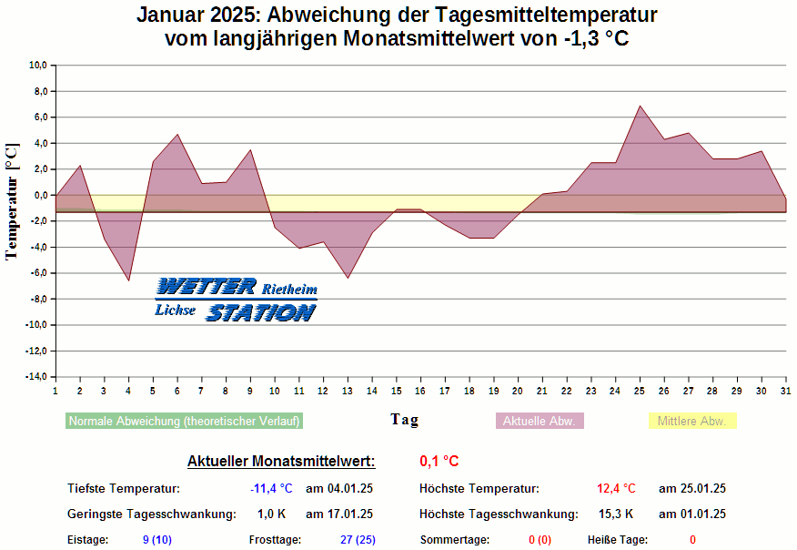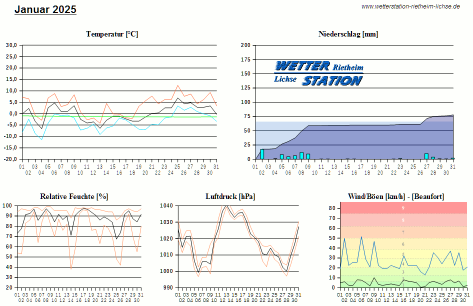 *************************************************** ************** T E M P E R A T U R ************** *************************************************** Mittlere Temperatur: 0,1 °C MIN Temperatur: -11,4 °C am 04.01.25 MAX Temperatur: 12,4 °C am 25.01.25 Mittlere MIN Temperatur: -3,5 °C Mittlere MAX Temperatur: 3,8 °C MIN Temp Delta : 1,0 K am 17.01.25 MAX Temp Delta : 15,3 K am 01.01.25 Mittl. Temp Delta: 7,3 K Starkfrosttage : 1 Eistage : 9 Frosttage : 27 Sommertage : 0 Heiße Tage : 0 *************************************************** ************ N I E D E R S C H L A G ************ *************************************************** Ges. Niederschlagsmenge: 78,0 mm MAX Niederschlag/Stunde: 3,6 mm am 07.01.25 MAX Niederschlag/Tag: 17,8 mm am 02.01.25 MAX Niederschlag in 24h: 17,8 mm am 02.01.25 MAX Niederschlag Rate: 32,6 mm/h am 06.01.25 Niederschlag an 18 Tagen Regentage (> 1mm) : 10 Regentage (> 3mm) : 8 Regentage (> 10mm) : 3 Regentage (> 20mm) : 0 *************************************************** ******************** W I N D ******************** *************************************************** Mittlere Windgeschwindigkeit: 1,3 m/s = 4,7 km/h Effektive Windrichtung: SSW Maximale Windgeschwindigkeit: 14,3 m/s = 51,5 km/h aus SSW am 06.01.25 Prozentuale Verteilung Windgeschwindigkeit: Bft_0 (bis 0,9 km/h) : 20.21 % Bft_1 (bis 5,6 km/h) : 43.62 % Bft_2 (bis 12 km/h) : 30.44 % Bft_3 (bis 20 km/h) : 5.61 % Bft_4 (bis 29 km/h) : 0.12 % Prozentuale Verteilung Windrichtung: N : 4.3 % NNO : 1.4 % NO : 0.6 % ONO : 0.3 % O : 0.6 % OSO : 12.6 % SO : 3.8 % SSO : 2.4 % S : 4.6 % SSW : 52.1 % SW : 5.7 % WSW : 4.0 % W : 2.5 % WNW : 1.3 % NW : 1.3 % NNW : 2.7 % *************************************************** *************** L U F T D R U C K *************** *************************************************** Mittlerer Luftdruck: 1018,4 hPa MIN Luftdruck: 996,8 hPa am 06.01.25 MAX Luftdruck: 1041,8 hPa am 13.01.25 *************************************************** ************ L U F T F E U C H T E ************** *************************************************** Mittlere rel. Luftfeuchte: 87,8 % MIN rel. Luftfeuchte: 38,0 % am 14.01.25 MAX rel. Luftfeuchte: 99,0 %