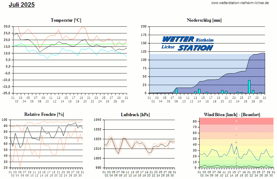 *************************************************** ************** T E M P E R A T U R ************** *************************************************** Mittlere Temperatur: 16,5 °C MIN Temperatur: 6,1 °C am 10.07.25 MAX Temperatur: 32,4 °C am 02.07.25 Mittlere MIN Temperatur: 11,5 °C Mittlere MAX Temperatur: 22,3 °C MIN Temp Delta : 3,6 K am 28.07.25 MAX Temp Delta : 18,6 K am 13.07.25 Mittl. Temp Delta: 10,9 K Starkfrosttage : 0 Eistage : 0 Frosttage : 0 Sommertage : 7 Heiße Tage : 2 *************************************************** ************ N I E D E R S C H L A G ************ *************************************************** Ges. Niederschlagsmenge: 120,6 mm MAX Niederschlag/Stunde: 14,0 mm am 27.07.25 MAX Niederschlag/Tag: 40,4 mm am 27.07.25 MAX Niederschlag in 24h: 40,4 mm am 27.07.25 MAX Niederschlag Rate: 145,8 mm/h am 14.07.25 Niederschlag an 21 Tagen Regentage (> 1mm) : 12 Regentage (> 3mm) : 10 Regentage (> 10mm) : 3 Regentage (> 20mm) : 1 *************************************************** ******************** W I N D ******************** *************************************************** Mittlere Windgeschwindigkeit: 0,7 m/s = 2,6 km/h Effektive Windrichtung: NW Maximale Windgeschwindigkeit: 11,6 m/s = 41,8 km/h aus S am 14.07.25 Prozentuale Verteilung Windgeschwindigkeit: Bft_0 (bis 0,9 km/h) : 35.20 % Bft_1 (bis 5,6 km/h) : 50.87 % Bft_2 (bis 12 km/h) : 13.78 % Bft_3 (bis 20 km/h) : 0.15 % Prozentuale Verteilung Windrichtung: N : 19.1 % NNO : 5.3 % NO : 4.7 % ONO : 0.7 % O : 0.7 % OSO : 5.0 % SO : 0.5 % SSO : 0.5 % S : 4.3 % SSW : 15.3 % SW : 3.2 % WSW : 3.6 % W : 2.3 % WNW : 10.7 % NW : 8.8 % NNW : 15.4 % *************************************************** *************** L U F T D R U C K *************** *************************************************** Mittlerer Luftdruck: 1013,9 hPa MIN Luftdruck: 1002,9 hPa am 20.07.25 MAX Luftdruck: 1023,6 hPa am 04.07.25 *************************************************** ************ L U F T F E U C H T E ************** *************************************************** Mittlere rel. Luftfeuchte: 77,7 % MIN rel. Luftfeuchte: 22,0 % am 05.07.25 MAX rel. Luftfeuchte: 98,0 %