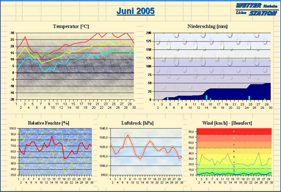 *************************************************** ************** T E M P E R A T U R ************** *************************************************** Mittlere Temperatur: 16,7 °C MIN Temperatur: 0,6 °C am 08.06.05 MAX Temperatur: 31,8 °C am 24.06.05 Mittlere MIN Temperatur: 10,6 °C Mittlere MAX Temperatur: 22,5 °C MIN Temp Delta : 6,1 K am 06.06.05 MAX Temp Delta : 18,2 K am 21.06.05 Mittl. Temp Delta: 11,9 K Starkfrosttage : 0 Eistage : 0 Frosttage : 0 Sommertage : 12 Heiße Tage : 3 *************************************************** ************ N I E D E R S C H L A G ************ *************************************************** Ges. Niederschlagsmenge: 50,5 mm MAX Niederschlag/Stunde: 10,7 mm am 14.06.05 MAX Niederschlag/Tag: 14,2 mm am 14.06.05 MAX Niederschlag in 24h: 19,6 mm am 15.06.05 MAX Niederschlag Rate: 75,4 mm/h am 04.06.05 Niederschlag an 9 Tagen Regentage (> 1mm) : 7 Regentage (> 3mm) : 6 Regentage (> 10mm) : 2 Regentage (> 20mm) : 0 *************************************************** ******************** W I N D ******************** *************************************************** Mittlere Windgeschwindigkeit: 0,7 m/s = 2,7 km/h Hauptwindrichtung: N Maximale Windgeschwindigkeit: 11,6 m/s = 41,8 km/h aus WSW am 25.06.05 Prozentuale Verteilung Windgeschwindigkeit: Bft_0 (bis 0,9 km/h) : 38.51 % Bft_1 (bis 5,6 km/h) : 44.16 % Bft_2 (bis 12 km/h) : 16.82 % Bft_3 (bis 20 km/h) : 0.50 % Bft_4 (bis 29 km/h) : 0.02 % Prozentuale Verteilung Windrichtung: N : 34.1 % NNO : 5.9 % NO : 2.8 % ONO : 0.7 % O : 6.8 % OSO : 6.3 % SO : 2.8 % SSO : 1.1 % S : 2.4 % SSW : 5.9 % SW : 4.0 % WSW : 7.7 % W : 3.1 % WNW : 1.4 % NW : 6.4 % NNW : 8.6 % *************************************************** *************** L U F T D R U C K *************** *************************************************** Mittlerer Luftdruck: 1018,0 hPa MIN Luftdruck: 1005,1 hPa am 29.06.05 MAX Luftdruck: 1034,9 hPa am 07.06.05 *************************************************** ************ L U F T F E U C H T E ************** *************************************************** Mittlere rel. Luftfeuchte: 67,4 % MIN rel. Luftfeuchte: 25,0 % am 19.06.05 MAX rel. Luftfeuchte: 97,0 %
