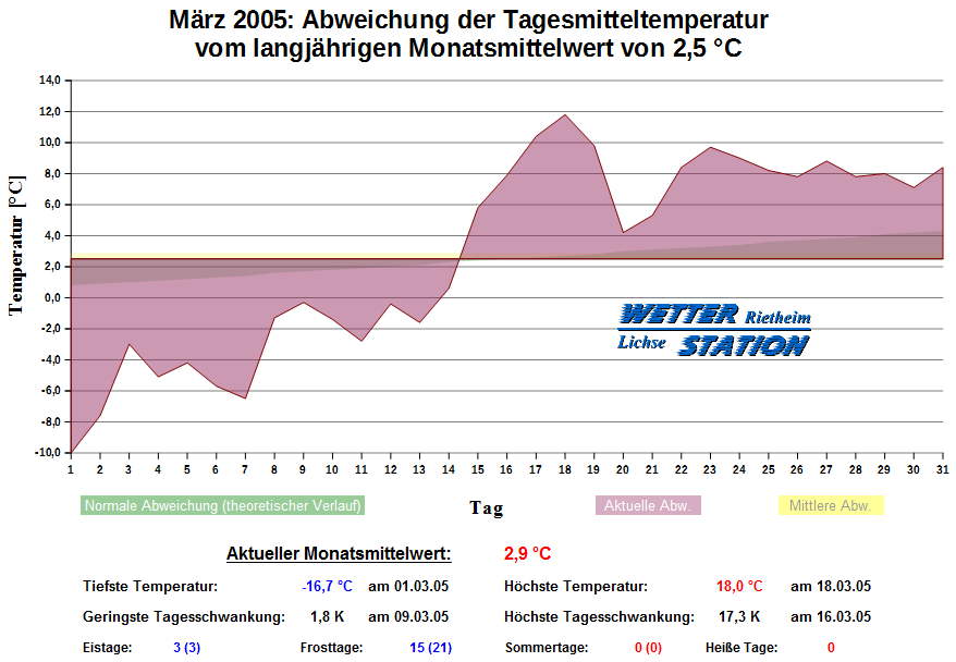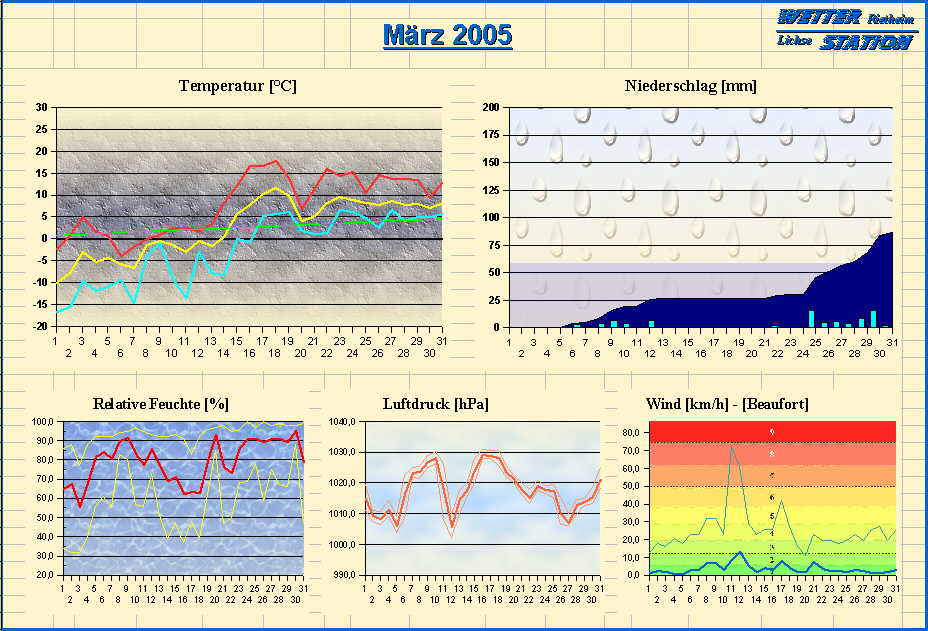 *************************************************** ************** T E M P E R A T U R ************** *************************************************** Mittlere Temperatur: 2,9 °C MIN Temperatur: -16,7 °C am 01.03.05 MAX Temperatur: 18,0 °C am 18.03.05 Mittlere MIN Temperatur: -2,1 °C Mittlere MAX Temperatur: 8,1 °C MIN Temp Delta : 1,8 K am 09.03.05 MAX Temp Delta : 17,3 K am 16.03.05 Mittl. Temp Delta: 10,2 K Starkfrosttage : 6 Eistage : 3 Frosttage : 15 Sommertage : 0 Heiße Tage : 0 *************************************************** ************ N I E D E R S C H L A G ************ *************************************************** Ges. Niederschlagsmenge: 86,9 mm MAX Niederschlag/Stunde: 4,1 mm am 25.03.05 MAX Niederschlag/Tag: 15,7 mm am 25.03.05 MAX Niederschlag in 24h: 17,8 mm am 31.03.05 MAX Niederschlag Rate: 18,3 mm/h am 29.03.05 Niederschlag an 18 Tagen Regentage (> 1mm) : 14 Regentage (> 3mm) : 11 Regentage (> 10mm) : 2 Regentage (> 20mm) : 0 *************************************************** ******************** W I N D ******************** *************************************************** Mittlere Windgeschwindigkeit: 1,1 m/s = 3,8 km/h Hauptwindrichtung: SW Maximale Windgeschwindigkeit: 20,1 m/s = 72,4 km/h aus SSW am 11.03.05 Prozentuale Verteilung Windgeschwindigkeit: Bft_0 (bis 0,9 km/h) : 28.38 % Bft_1 (bis 5,6 km/h) : 45.04 % Bft_2 (bis 12 km/h) : 22.34 % Bft_3 (bis 20 km/h) : 3.36 % Bft_4 (bis 29 km/h) : 0.87 % Prozentuale Verteilung Windrichtung: N : 4.3 % NNO : 0.7 % NO : 0.6 % ONO : 2.7 % O : 9.8 % OSO : 1.3 % SO : 4.5 % SSO : 0.5 % S : 9.5 % SSW : 4.8 % SW : 33.1 % WSW : 8.0 % W : 2.7 % WNW : 4.5 % NW : 6.9 % NNW : 6.3 % *************************************************** *************** L U F T D R U C K *************** *************************************************** Mittlerer Luftdruck: 1017,8 hPa MIN Luftdruck: 1002,2 hPa am 12.03.05 MAX Luftdruck: 1031,0 hPa am 16.03.05 *************************************************** ************ L U F T F E U C H T E ************** *************************************************** Mittlere rel. Luftfeuchte: 79,4 % MIN rel. Luftfeuchte: 32,0 % am 02.03.05 MAX rel. Luftfeuchte: 100,0 %