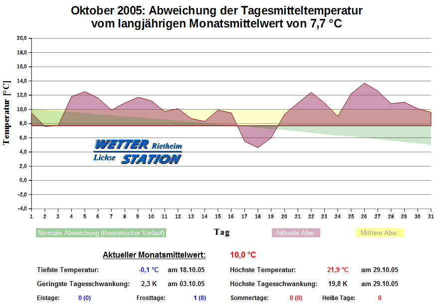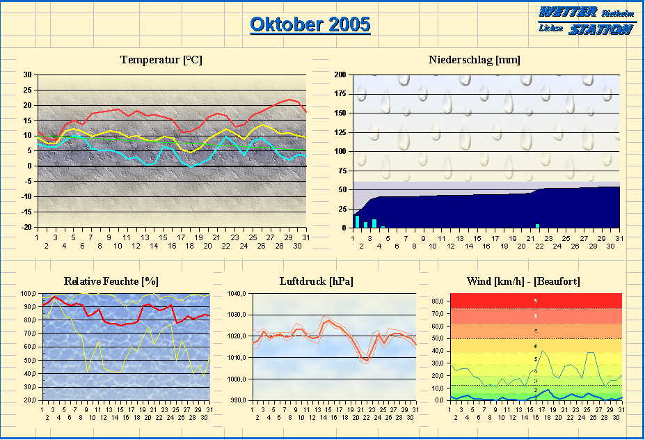 *************************************************** ************** T E M P E R A T U R ************** *************************************************** Mittlere Temperatur: 10,0 °C MIN Temperatur: -0,1 °C am 18.10.05 MAX Temperatur: 21,9 °C am 29.10.05 Mittlere MIN Temperatur: 5,1 °C Mittlere MAX Temperatur: 16,0 °C MIN Temp Delta : 2,3 K am 03.10.05 MAX Temp Delta : 19,8 K am 29.10.05 Mittl. Temp Delta: 10,8 K Starkfrosttage : 0 Eistage : 0 Frosttage : 1 Sommertage : 0 Heiße Tage : 0 *************************************************** ************ N I E D E R S C H L A G ************ *************************************************** Ges. Niederschlagsmenge: 54,4 mm MAX Niederschlag/Stunde: 3,3 mm am 22.10.05 MAX Niederschlag/Tag: 16,8 mm am 01.10.05 MAX Niederschlag in 24h: 21,3 mm am 02.10.05 MAX Niederschlag Rate: 11,7 mm/h am 22.10.05 Niederschlag an 19 Tagen Regentage (> 1mm) : 6 Regentage (> 3mm) : 5 Regentage (> 10mm) : 2 Regentage (> 20mm) : 0 *************************************************** ******************** W I N D ******************** *************************************************** Mittlere Windgeschwindigkeit: 0,7 m/s = 2,7 km/h Hauptwindrichtung: SSO Maximale Windgeschwindigkeit: 11,2 m/s = 40,3 km/h aus OSO am 17.10.05 Prozentuale Verteilung Windgeschwindigkeit: Bft_0 (bis 0,9 km/h) : 40.27 % Bft_1 (bis 5,6 km/h) : 41.64 % Bft_2 (bis 12 km/h) : 16.42 % Bft_3 (bis 20 km/h) : 1.67 % Prozentuale Verteilung Windrichtung: N : 5.1 % NNO : 3.7 % NO : 2.3 % ONO : 0.6 % O : 13.3 % OSO : 18.9 % SO : 9.7 % SSO : 5.1 % S : 3.2 % SSW : 26.6 % SW : 5.0 % WSW : 4.0 % W : 0.6 % WNW : 0.1 % NW : 0.8 % NNW : 1.1 % *************************************************** *************** L U F T D R U C K *************** *************************************************** Mittlerer Luftdruck: 1019,8 hPa MIN Luftdruck: 1007,3 hPa am 22.10.05 MAX Luftdruck: 1029,3 hPa am 14.10.05 *************************************************** ************ L U F T F E U C H T E ************** *************************************************** Mittlere rel. Luftfeuchte: 85,9 % MIN rel. Luftfeuchte: 38,0 % am 30.10.05 MAX rel. Luftfeuchte: 100,0 %