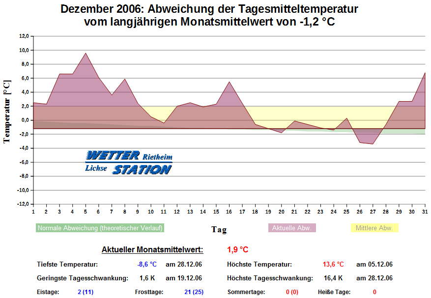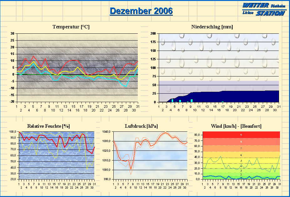 *************************************************** ************** T E M P E R A T U R ************** *************************************************** Mittlere Temperatur: 1,9 °C MIN Temperatur: -8,6 °C am 28.12.06 MAX Temperatur: 13,6 °C am 05.12.06 Mittlere MIN Temperatur: -1,1 °C Mittlere MAX Temperatur: 5,9 °C MIN Temp Delta : 1,6 K am 19.12.06 MAX Temp Delta : 16,4 K am 28.12.06 Mittl. Temp Delta: 7,0 K Starkfrosttage : 0 Eistage : 2 Frosttage : 21 Sommertage : 0 Heiße Tage : 0 *************************************************** ************ N I E D E R S C H L A G ************ *************************************************** Ges. Niederschlagsmenge: 33,8 mm MAX Niederschlag/Stunde: 3,0 mm am 06.12.06 MAX Niederschlag/Tag: 8,6 mm am 04.12.06 MAX Niederschlag in 24h: 9,4 mm am 09.12.06 MAX Niederschlag Rate: 22,4 mm/h am 04.12.06 Niederschlag an 10 Tagen Regentage (> 1mm) : 7 Regentage (> 3mm) : 3 Regentage (> 10mm) : 0 Regentage (> 20mm) : 0 *************************************************** ******************** W I N D ******************** *************************************************** Mittlere Windgeschwindigkeit: 1,1 m/s = 4,0 km/h Hauptwindrichtung: S Maximale Windgeschwindigkeit: 12,1 m/s = 43,6 km/h aus WNW am 31.12.06 Prozentuale Verteilung Windgeschwindigkeit: Bft_0 (bis 0,9 km/h) : 24.38 % Bft_1 (bis 5,6 km/h) : 45.04 % Bft_2 (bis 12 km/h) : 27.99 % Bft_3 (bis 20 km/h) : 2.59 % Prozentuale Verteilung Windrichtung: N : 2.7 % NNO : 0.5 % NO : 5.5 % ONO : 2.0 % O : 6.3 % OSO : 10.2 % SO : 0.9 % SSO : 8.3 % S : 3.0 % SSW : 43.0 % SW : 6.2 % WSW : 5.2 % W : 2.9 % WNW : 0.4 % NW : 1.5 % NNW : 1.2 % *************************************************** *************** L U F T D R U C K *************** *************************************************** Mittlerer Luftdruck: 1026,1 hPa MIN Luftdruck: 995,1 hPa am 08.12.06 MAX Luftdruck: 1039,9 hPa am 22.12.06 *************************************************** ************ L U F T F E U C H T E ************** *************************************************** Mittlere rel. Luftfeuchte: 86,2 % MIN rel. Luftfeuchte: 37,0 % am 28.12.06 MAX rel. Luftfeuchte: 100,0 %