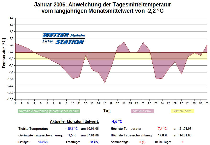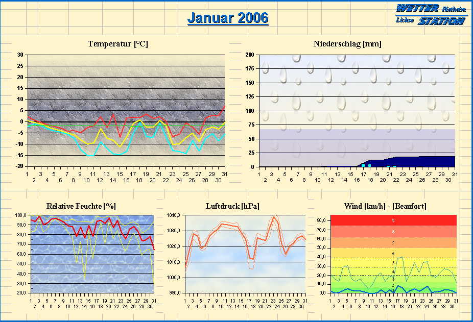 *************************************************** ************** T E M P E R A T U R ************** *************************************************** Mittlere Temperatur: -4,5 °C MIN Temperatur: -15,1 °C am 10.01.06 MAX Temperatur: 7,4 °C am 31.01.06 Mittlere MIN Temperatur: -8,0 °C Mittlere MAX Temperatur: -0,5 °C MIN Temp Delta : 1,5 K am 07.01.06 MAX Temp Delta : 17,8 K am 14.01.06 Mittl. Temp Delta: 7,5 K Starkfrosttage : 11 Eistage : 16 Frosttage : 31 Sommertage : 0 Heiße Tage : 0 *************************************************** ************ N I E D E R S C H L A G ************ *************************************************** Ges. Niederschlagsmenge: 18,5 mm MAX Niederschlag/Stunde: 1,0 mm am 18.01.06 MAX Niederschlag/Tag: 5,6 mm am 17.01.06 MAX Niederschlag in 24h: 8,4 mm am 18.01.06 MAX Niederschlag Rate: 4,3 mm/h am 21.01.06 Niederschlag an 11 Tagen Regentage (> 1mm) : 4 Regentage (> 3mm) : 2 Regentage (> 10mm) : 0 Regentage (> 20mm) : 0 *************************************************** ******************** W I N D ******************** *************************************************** Mittlere Windgeschwindigkeit: 0,9 m/s = 3,1 km/h Hauptwindrichtung: S Maximale Windgeschwindigkeit: 11,2 m/s = 40,3 km/h aus NW am 18.01.06 Prozentuale Verteilung Windgeschwindigkeit: Bft_0 (bis 0,9 km/h) : 30.70 % Bft_1 (bis 5,6 km/h) : 48.95 % Bft_2 (bis 12 km/h) : 18.99 % Bft_3 (bis 20 km/h) : 1.37 % Prozentuale Verteilung Windrichtung: N : 9.9 % NNO : 1.1 % NO : 2.1 % ONO : 0.5 % O : 2.1 % OSO : 19.6 % SO : 3.4 % SSO : 15.9 % S : 1.1 % SSW : 24.9 % SW : 8.0 % WSW : 4.0 % W : 4.1 % WNW : 0.6 % NW : 1.8 % NNW : 1.1 % *************************************************** *************** L U F T D R U C K *************** *************************************************** Mittlerer Luftdruck: 1025,5 hPa MIN Luftdruck: 1003,4 hPa am 01.01.06 MAX Luftdruck: 1040,4 hPa am 23.01.06 *************************************************** ************ L U F T F E U C H T E ************** *************************************************** Mittlere rel. Luftfeuchte: 87,5 % MIN rel. Luftfeuchte: 29,0 % am 31.01.06 MAX rel. Luftfeuchte: 100,0 %