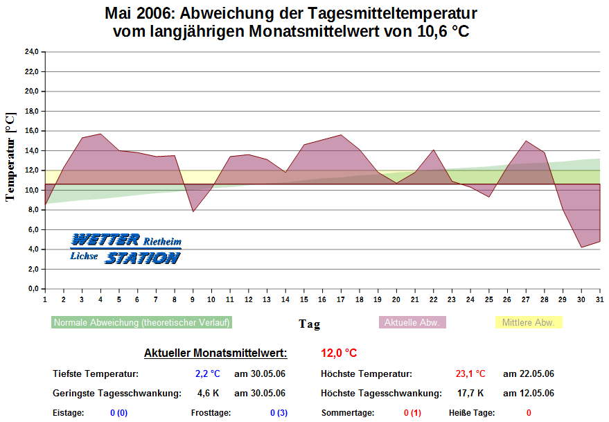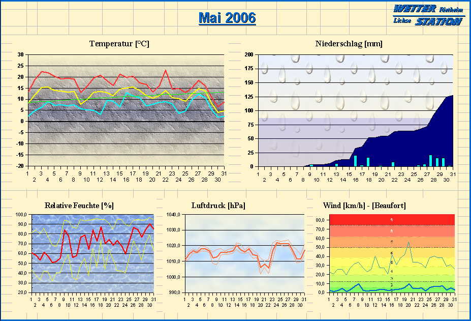 *************************************************** ************** T E M P E R A T U R ************** *************************************************** Mittlere Temperatur: 12,0 °C MIN Temperatur: 2,2 °C am 30.05.06 MAX Temperatur: 23,1 °C am 22.05.06 Mittlere MIN Temperatur: 7,3 °C Mittlere MAX Temperatur: 17,0 °C MIN Temp Delta : 4,6 K am 30.05.06 MAX Temp Delta : 17,7 K am 12.05.06 Mittl. Temp Delta: 9,7 K Starkfrosttage : 0 Eistage : 0 Frosttage : 0 Sommertage : 0 Heiße Tage : 0 *************************************************** ************ N I E D E R S C H L A G ************ *************************************************** Ges. Niederschlagsmenge: 127,0 mm MAX Niederschlag/Stunde: 15,0 mm am 16.05.06 MAX Niederschlag/Tag: 21,1 mm am 28.05.06 MAX Niederschlag in 24h: 25,7 mm am 30.05.06 MAX Niederschlag Rate: 149,4 mm/h am 16.05.06 Niederschlag an 17 Tagen Regentage (> 1mm) : 15 Regentage (> 3mm) : 11 Regentage (> 10mm) : 5 Regentage (> 20mm) : 2 *************************************************** ******************** W I N D ******************** *************************************************** Mittlere Windgeschwindigkeit: 1,3 m/s = 4,5 km/h Hauptwindrichtung: SW Maximale Windgeschwindigkeit: 15,6 m/s = 56,3 km/h aus SSW am 20.05.06 Prozentuale Verteilung Windgeschwindigkeit: Bft_0 (bis 0,9 km/h) : 24.62 % Bft_1 (bis 5,6 km/h) : 39.34 % Bft_2 (bis 12 km/h) : 29.93 % Bft_3 (bis 20 km/h) : 5.82 % Bft_4 (bis 29 km/h) : 0.29 % Prozentuale Verteilung Windrichtung: N : 12.5 % NNO : 0.6 % NO : 1.1 % ONO : 0.8 % O : 4.2 % OSO : 18.2 % SO : 0.8 % SSO : 3.3 % S : 0.7 % SSW : 10.8 % SW : 6.2 % WSW : 21.5 % W : 12.8 % WNW : 1.0 % NW : 3.5 % NNW : 2.0 % *************************************************** *************** L U F T D R U C K *************** *************************************************** Mittlerer Luftdruck: 1015,6 hPa MIN Luftdruck: 1002,1 hPa am 20.05.06 MAX Luftdruck: 1023,7 hPa am 27.05.06 *************************************************** ************ L U F T F E U C H T E ************** *************************************************** Mittlere rel. Luftfeuchte: 70,7 % MIN rel. Luftfeuchte: 32,0 % am 06.05.06 MAX rel. Luftfeuchte: 97,0 %