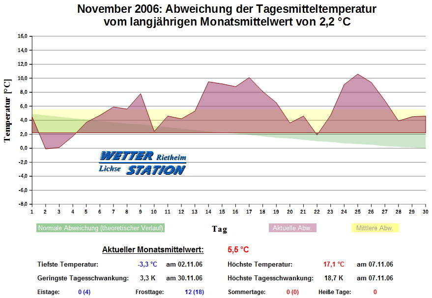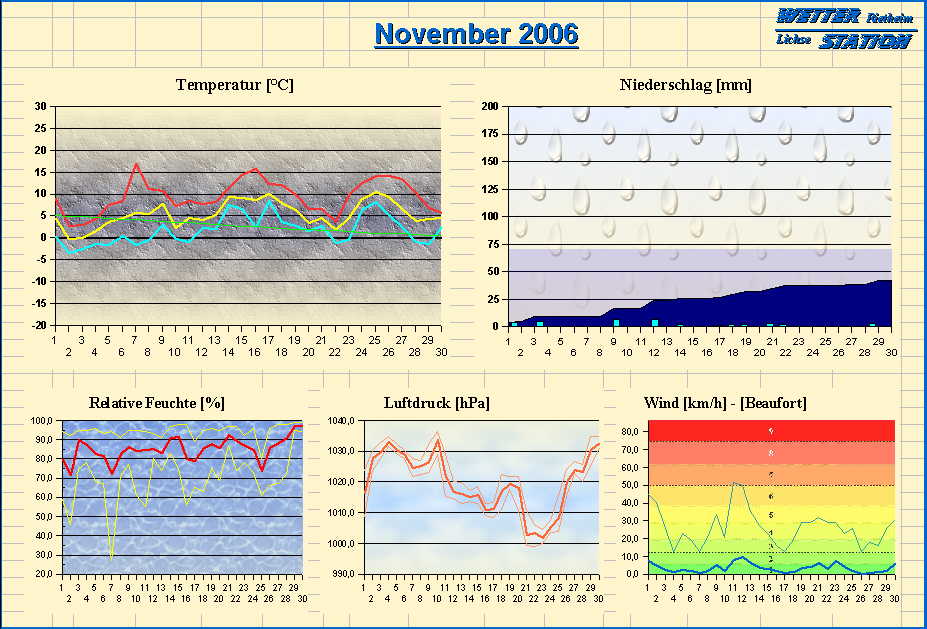 *************************************************** ************** T E M P E R A T U R ************** *************************************************** Mittlere Temperatur: 5,5 °C MIN Temperatur: -3,3 °C am 02.11.06 MAX Temperatur: 17,1 °C am 07.11.06 Mittlere MIN Temperatur: 1,8 °C Mittlere MAX Temperatur: 9,6 °C MIN Temp Delta : 3,3 K am 30.11.06 MAX Temp Delta : 18,7 K am 07.11.06 Mittl. Temp Delta: 7,8 K Starkfrosttage : 0 Eistage : 0 Frosttage : 12 Sommertage : 0 Heiße Tage : 0 *************************************************** ************ N I E D E R S C H L A G ************ *************************************************** Ges. Niederschlagsmenge: 41,9 mm MAX Niederschlag/Stunde: 3,0 mm am 01.11.06 MAX Niederschlag/Tag: 7,1 mm am 09.11.06 MAX Niederschlag in 24h: 7,1 mm am 09.11.06 MAX Niederschlag Rate: 10,9 mm/h am 01.11.06 Niederschlag an 15 Tagen Regentage (> 1mm) : 11 Regentage (> 3mm) : 6 Regentage (> 10mm) : 0 Regentage (> 20mm) : 0 *************************************************** ******************** W I N D ******************** *************************************************** Mittlere Windgeschwindigkeit: 1,0 m/s = 3,7 km/h Hauptwindrichtung: SW Maximale Windgeschwindigkeit: 14,3 m/s = 51,5 km/h aus SW am 11.11.06 Prozentuale Verteilung Windgeschwindigkeit: Bft_0 (bis 0,9 km/h) : 28.58 % Bft_1 (bis 5,6 km/h) : 42.88 % Bft_2 (bis 12 km/h) : 25.66 % Bft_3 (bis 20 km/h) : 2.87 % Bft_4 (bis 29 km/h) : 0.01 % Prozentuale Verteilung Windrichtung: N : 12.9 % NNO : 0.3 % NO : 0.1 % ONO : 0.1 % O : 1.0 % OSO : 4.4 % SO : 0.8 % SSO : 8.8 % S : 3.2 % SSW : 25.7 % SW : 6.1 % WSW : 13.3 % W : 12.7 % WNW : 1.8 % NW : 5.8 % NNW : 3.0 % *************************************************** *************** L U F T D R U C K *************** *************************************************** Mittlerer Luftdruck: 1019,8 hPa MIN Luftdruck: 999,1 hPa am 22.11.06 MAX Luftdruck: 1036,5 hPa am 10.11.06 *************************************************** ************ L U F T F E U C H T E ************** *************************************************** Mittlere rel. Luftfeuchte: 85,4 % MIN rel. Luftfeuchte: 27,0 % am 07.11.06 MAX rel. Luftfeuchte: 99,0 %