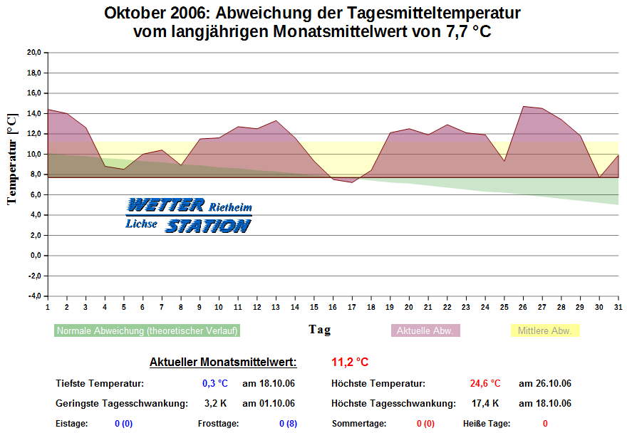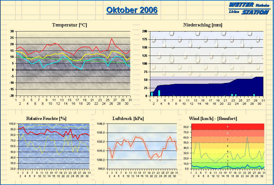 *************************************************** ************** T E M P E R A T U R ************** *************************************************** Mittlere Temperatur: 11,2 °C MIN Temperatur: 0,3 °C am 18.10.06 MAX Temperatur: 24,6 °C am 26.10.06 Mittlere MIN Temperatur: 7,0 °C Mittlere MAX Temperatur: 16,3 °C MIN Temp Delta : 3,2 K am 01.10.06 MAX Temp Delta : 17,4 K am 18.10.06 Mittl. Temp Delta: 9,3 K Starkfrosttage : 0 Eistage : 0 Frosttage : 0 Sommertage : 0 Heiße Tage : 0 *************************************************** ************ N I E D E R S C H L A G ************ *************************************************** Ges. Niederschlagsmenge: 59,7 mm MAX Niederschlag/Stunde: 5,8 mm am 01.10.06 MAX Niederschlag/Tag: 18,5 mm am 03.10.06 MAX Niederschlag in 24h: 19,1 mm am 03.10.06 MAX Niederschlag Rate: 95,0 mm/h am 24.10.06 Niederschlag an 12 Tagen Regentage (> 1mm) : 10 Regentage (> 3mm) : 5 Regentage (> 10mm) : 2 Regentage (> 20mm) : 0 *************************************************** ******************** W I N D ******************** *************************************************** Mittlere Windgeschwindigkeit: 0,9 m/s = 3,2 km/h Hauptwindrichtung: SSW Maximale Windgeschwindigkeit: 17,0 m/s = 61,2 km/h aus SW am 24.10.06 Prozentuale Verteilung Windgeschwindigkeit: Bft_0 (bis 0,9 km/h) : 35.07 % Bft_1 (bis 5,6 km/h) : 41.98 % Bft_2 (bis 12 km/h) : 20.22 % Bft_3 (bis 20 km/h) : 2.51 % Bft_4 (bis 29 km/h) : 0.21 % Bft_5 (bis 39 km/h) : 0.01 % Prozentuale Verteilung Windrichtung: N : 5.1 % NNO : 0.7 % NO : 1.6 % ONO : 0.5 % O : 2.9 % OSO : 12.6 % SO : 1.4 % SSO : 10.0 % S : 3.4 % SSW : 27.5 % SW : 6.3 % WSW : 15.4 % W : 8.6 % WNW : 0.9 % NW : 2.1 % NNW : 1.1 % *************************************************** *************** L U F T D R U C K *************** *************************************************** Mittlerer Luftdruck: 1015,2 hPa MIN Luftdruck: 998,4 hPa am 03.10.06 MAX Luftdruck: 1027,1 hPa am 13.10.06 *************************************************** ************ L U F T F E U C H T E ************** *************************************************** Mittlere rel. Luftfeuchte: 83,7 % MIN rel. Luftfeuchte: 45,0 % am 18.10.06 MAX rel. Luftfeuchte: 98,0 %