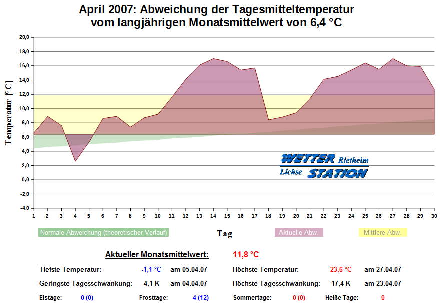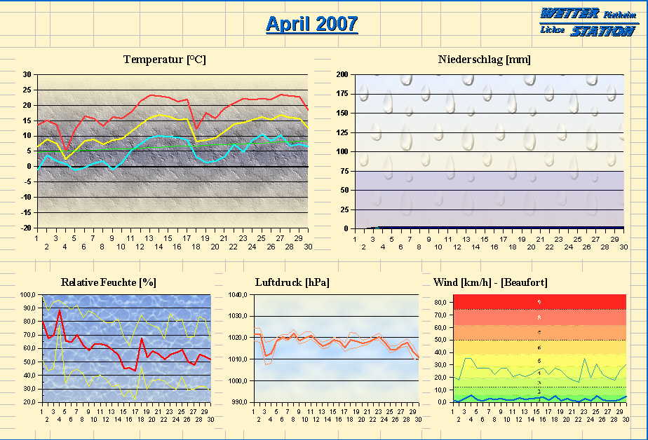 *************************************************** ************** T E M P E R A T U R ************** *************************************************** Mittlere Temperatur: 11,8 °C MIN Temperatur: -1,1 °C am 05.04.07 MAX Temperatur: 23,6 °C am 27.04.07 Mittlere MIN Temperatur: 5,0 °C Mittlere MAX Temperatur: 18,4 °C MIN Temp Delta : 4,1 K am 04.04.07 MAX Temp Delta : 17,4 K am 23.04.07 Mittl. Temp Delta: 13,4 K Starkfrosttage : 0 Eistage : 0 Frosttage : 4 Sommertage : 0 Heiße Tage : 0 *************************************************** ************ N I E D E R S C H L A G ************ *************************************************** Ges. Niederschlagsmenge: 3,6 mm MAX Niederschlag/Stunde: 1,0 mm am 03.04.07 MAX Niederschlag/Tag: 2,3 mm am 03.04.07 MAX Niederschlag in 24h: 3,6 mm am 04.04.07 MAX Niederschlag Rate: 10,4 mm/h am 03.04.07 Niederschlag an 2 Tagen Regentage (> 1mm) : 2 Regentage (> 3mm) : 0 Regentage (> 10mm) : 0 Regentage (> 20mm) : 0 *************************************************** ******************** W I N D ******************** *************************************************** Mittlere Windgeschwindigkeit: 0,8 m/s = 2,8 km/h Hauptwindrichtung: NO Maximale Windgeschwindigkeit: 9,8 m/s = 35,4 km/h aus N am 03.04.07 Prozentuale Verteilung Windgeschwindigkeit: Bft_0 (bis 0,9 km/h) : 42.09 % Bft_1 (bis 5,6 km/h) : 36.64 % Bft_2 (bis 12 km/h) : 20.08 % Bft_3 (bis 20 km/h) : 1.18 % Prozentuale Verteilung Windrichtung: N : 25.5 % NNO : 5.9 % NO : 12.8 % ONO : 4.0 % O : 12.4 % OSO : 26.0 % SO : 1.7 % SSO : 1.5 % S : 0.2 % SSW : 0.8 % SW : 0.5 % WSW : 1.4 % W : 2.3 % WNW : 0.4 % NW : 2.3 % NNW : 2.4 % *************************************************** *************** L U F T D R U C K *************** *************************************************** Mittlerer Luftdruck: 1017,8 hPa MIN Luftdruck: 1007,4 hPa am 03.04.07 MAX Luftdruck: 1024,5 hPa am 01.04.07 *************************************************** ************ L U F T F E U C H T E ************** *************************************************** Mittlere rel. Luftfeuchte: 59,6 % MIN rel. Luftfeuchte: 22,0 % am 17.04.07 MAX rel. Luftfeuchte: 99,0 %