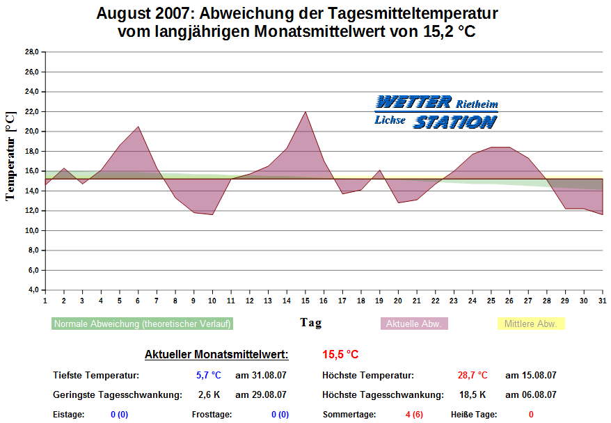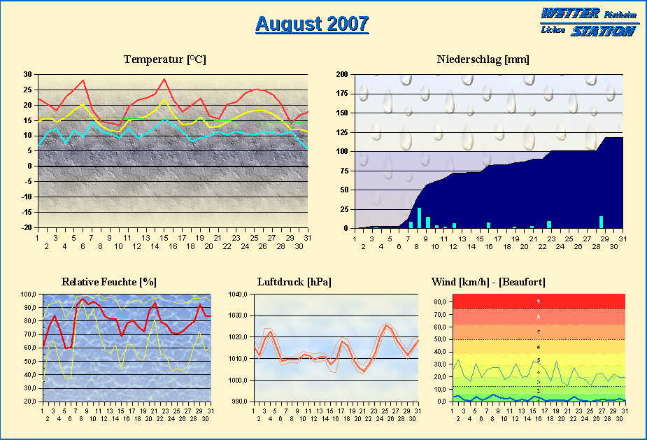 *************************************************** ************** T E M P E R A T U R ************** *************************************************** Mittlere Temperatur: 15,5 °C MIN Temperatur: 5,7 °C am 31.08.07 MAX Temperatur: 28,7 °C am 15.08.07 Mittlere MIN Temperatur: 10,8 °C Mittlere MAX Temperatur: 20,6 °C MIN Temp Delta : 2,6 K am 29.08.07 MAX Temp Delta : 18,5 K am 06.08.07 Mittl. Temp Delta: 9,8 K Starkfrosttage : 0 Eistage : 0 Frosttage : 0 Sommertage : 4 Heiße Tage : 0 *************************************************** ************ N I E D E R S C H L A G ************ *************************************************** Ges. Niederschlagsmenge: 118,1 mm MAX Niederschlag/Stunde: 7,6 mm am 12.08.07 MAX Niederschlag/Tag: 27,7 mm am 08.08.07 MAX Niederschlag in 24h: 36,6 mm am 09.08.07 MAX Niederschlag Rate: 155,7 mm/h am 12.08.07 Niederschlag an 17 Tagen Regentage (> 1mm) : 14 Regentage (> 3mm) : 11 Regentage (> 10mm) : 4 Regentage (> 20mm) : 1 *************************************************** ******************** W I N D ******************** *************************************************** Mittlere Windgeschwindigkeit: 0,7 m/s = 2,4 km/h Hauptwindrichtung: NNW Maximale Windgeschwindigkeit: 9,4 m/s = 33,8 km/h aus SW am 02.08.07 Prozentuale Verteilung Windgeschwindigkeit: Bft_0 (bis 0,9 km/h) : 45.65 % Bft_1 (bis 5,6 km/h) : 40.24 % Bft_2 (bis 12 km/h) : 12.88 % Bft_3 (bis 20 km/h) : 1.22 % Prozentuale Verteilung Windrichtung: N : 32.4 % NNO : 2.5 % NO : 1.4 % ONO : 0.4 % O : 1.4 % OSO : 11.9 % SO : 2.0 % SSO : 7.4 % S : 2.0 % SSW : 17.3 % SW : 3.4 % WSW : 4.4 % W : 4.7 % WNW : 1.1 % NW : 3.5 % NNW : 4.1 % *************************************************** *************** L U F T D R U C K *************** *************************************************** Mittlerer Luftdruck: 1013,6 hPa MIN Luftdruck: 1002,8 hPa am 21.08.07 MAX Luftdruck: 1026,6 hPa am 25.08.07 *************************************************** ************ L U F T F E U C H T E ************** *************************************************** Mittlere rel. Luftfeuchte: 80,0 % MIN rel. Luftfeuchte: 35,0 % am 01.08.07 MAX rel. Luftfeuchte: 100,0 %