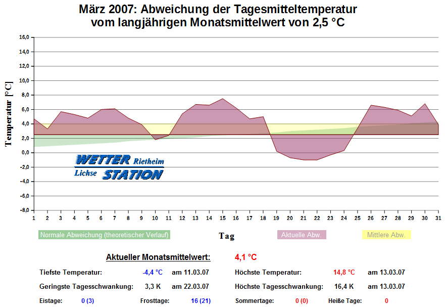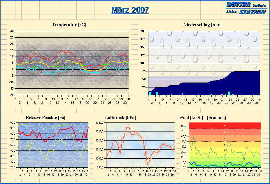 *************************************************** ************** T E M P E R A T U R ************** *************************************************** Mittlere Temperatur: 4,1 °C MIN Temperatur: -4,4 °C am 11.03.07 MAX Temperatur: 14,8 °C am 13.03.07 Mittlere MIN Temperatur: -0,0 °C Mittlere MAX Temperatur: 8,7 °C MIN Temp Delta : 3,3 K am 22.03.07 MAX Temp Delta : 16,4 K am 13.03.07 Mittl. Temp Delta: 8,8 K Starkfrosttage : 0 Eistage : 0 Frosttage : 16 Sommertage : 0 Heiße Tage : 0 *************************************************** ************ N I E D E R S C H L A G ************ *************************************************** Ges. Niederschlagsmenge: 77,5 mm MAX Niederschlag/Stunde: 3,6 mm am 03.03.07 MAX Niederschlag/Tag: 11,9 mm am 23.03.07 MAX Niederschlag in 24h: 16,0 mm am 23.03.07 MAX Niederschlag Rate: 22,9 mm/h am 03.03.07 Niederschlag an 18 Tagen Regentage (> 1mm) : 15 Regentage (> 3mm) : 9 Regentage (> 10mm) : 3 Regentage (> 20mm) : 0 *************************************************** ******************** W I N D ******************** *************************************************** Mittlere Windgeschwindigkeit: 1,3 m/s = 4,7 km/h Hauptwindrichtung: WSW Maximale Windgeschwindigkeit: 16,5 m/s = 59,5 km/h aus W am 03.03.07 Prozentuale Verteilung Windgeschwindigkeit: Bft_0 (bis 0,9 km/h) : 28.19 % Bft_1 (bis 5,6 km/h) : 34.43 % Bft_2 (bis 12 km/h) : 30.19 % Bft_3 (bis 20 km/h) : 6.75 % Bft_4 (bis 29 km/h) : 0.44 % Prozentuale Verteilung Windrichtung: N : 19.4 % NNO : 1.1 % NO : 2.2 % ONO : 1.0 % O : 6.9 % OSO : 15.2 % SO : 1.0 % SSO : 4.1 % S : 0.7 % SSW : 10.6 % SW : 6.0 % WSW : 14.7 % W : 11.6 % WNW : 1.0 % NW : 2.3 % NNW : 2.1 % *************************************************** *************** L U F T D R U C K *************** *************************************************** Mittlerer Luftdruck: 1015,3 hPa MIN Luftdruck: 990,0 hPa am 19.03.07 MAX Luftdruck: 1038,8 hPa am 10.03.07 *************************************************** ************ L U F T F E U C H T E ************** *************************************************** Mittlere rel. Luftfeuchte: 79,5 % MIN rel. Luftfeuchte: 32,0 % am 13.03.07 MAX rel. Luftfeuchte: 97,0 %