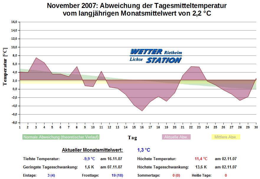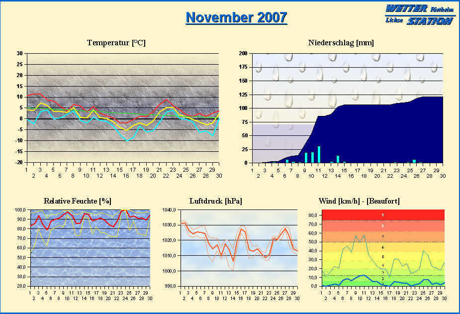 *************************************************** ************** T E M P E R A T U R ************** *************************************************** Mittlere Temperatur: 1,3 °C MIN Temperatur: -9,9 °C am 16.11.07 MAX Temperatur: 11,4 °C am 02.11.07 Mittlere MIN Temperatur: -1,6 °C Mittlere MAX Temperatur: 4,3 °C MIN Temp Delta : 1,6 K am 07.11.07 MAX Temp Delta : 13,6 K am 02.11.07 Mittl. Temp Delta: 5,9 K Starkfrosttage : 0 Eistage : 3 Frosttage : 19 Sommertage : 0 Heiße Tage : 0 *************************************************** ************ N I E D E R S C H L A G ************ *************************************************** Ges. Niederschlagsmenge: 121,4 mm MAX Niederschlag/Stunde: 4,8 mm am 11.11.07 MAX Niederschlag/Tag: 31,5 mm am 11.11.07 MAX Niederschlag in 24h: 33,0 mm am 11.11.07 MAX Niederschlag Rate: 17,0 mm/h am 11.11.07 Niederschlag an 18 Tagen Regentage (> 1mm) : 14 Regentage (> 3mm) : 9 Regentage (> 10mm) : 4 Regentage (> 20mm) : 2 *************************************************** ******************** W I N D ******************** *************************************************** Mittlere Windgeschwindigkeit: 1,3 m/s = 4,6 km/h Hauptwindrichtung: W Maximale Windgeschwindigkeit: 16,1 m/s = 57,9 km/h aus W am 11.11.07 Prozentuale Verteilung Windgeschwindigkeit: Bft_0 (bis 0,9 km/h) : 28.72 % Bft_1 (bis 5,6 km/h) : 35.02 % Bft_2 (bis 12 km/h) : 28.99 % Bft_3 (bis 20 km/h) : 6.78 % Bft_4 (bis 29 km/h) : 0.47 % Bft_5 (bis 39 km/h) : 0.01 % Prozentuale Verteilung Windrichtung: N : 15.4 % NNO : 1.2 % NO : 0.5 % ONO : 0.2 % O : 0.7 % OSO : 4.7 % SO : 1.2 % SSO : 4.5 % S : 0.4 % SSW : 9.5 % SW : 4.8 % WSW : 19.7 % W : 24.5 % WNW : 2.8 % NW : 6.8 % NNW : 3.0 % *************************************************** *************** L U F T D R U C K *************** *************************************************** Mittlerer Luftdruck: 1019,3 hPa MIN Luftdruck: 1000,2 hPa am 14.11.07 MAX Luftdruck: 1033,3 hPa am 02.11.07 *************************************************** ************ L U F T F E U C H T E ************** *************************************************** Mittlere rel. Luftfeuchte: 90,5 % MIN rel. Luftfeuchte: 56,0 % am 01.11.07 MAX rel. Luftfeuchte: 100,0 %