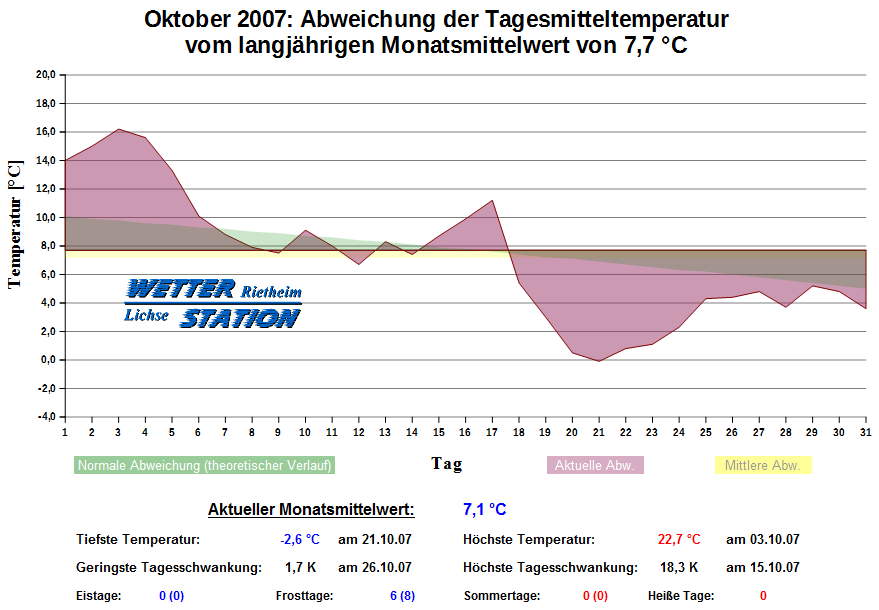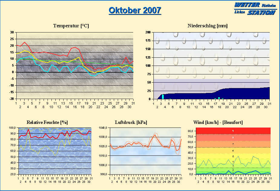 *************************************************** ************** T E M P E R A T U R ************** *************************************************** Mittlere Temperatur: 7,1 °C MIN Temperatur: -2,6 °C am 21.10.07 MAX Temperatur: 22,7 °C am 03.10.07 Mittlere MIN Temperatur: 3,4 °C Mittlere MAX Temperatur: 11,5 °C MIN Temp Delta : 1,7 K am 26.10.07 MAX Temp Delta : 18,3 K am 15.10.07 Mittl. Temp Delta: 8,1 K Starkfrosttage : 0 Eistage : 0 Frosttage : 6 Sommertage : 0 Heiße Tage : 0 *************************************************** ************ N I E D E R S C H L A G ************ *************************************************** Ges. Niederschlagsmenge: 35,6 mm MAX Niederschlag/Stunde: 14,0 mm am 03.10.07 MAX Niederschlag/Tag: 14,5 mm am 03.10.07 MAX Niederschlag in 24h: 14,5 mm am 03.10.07 MAX Niederschlag Rate: 114,3 mm/h am 03.10.07 Niederschlag an 11 Tagen Regentage (> 1mm) : 7 Regentage (> 3mm) : 4 Regentage (> 10mm) : 1 Regentage (> 20mm) : 0 *************************************************** ******************** W I N D ******************** *************************************************** Mittlere Windgeschwindigkeit: 0,7 m/s = 2,6 km/h Hauptwindrichtung: O Maximale Windgeschwindigkeit: 9,4 m/s = 33,8 km/h aus N am 18.10.07 Prozentuale Verteilung Windgeschwindigkeit: Bft_0 (bis 0,9 km/h) : 42.48 % Bft_1 (bis 5,6 km/h) : 39.31 % Bft_2 (bis 12 km/h) : 17.71 % Bft_3 (bis 20 km/h) : 0.49 % Prozentuale Verteilung Windrichtung: N : 17.8 % NNO : 3.0 % NO : 10.9 % ONO : 4.2 % O : 14.4 % OSO : 17.9 % SO : 2.2 % SSO : 5.8 % S : 0.5 % SSW : 12.9 % SW : 2.0 % WSW : 1.5 % W : 1.9 % WNW : 0.4 % NW : 1.8 % NNW : 2.8 % *************************************************** *************** L U F T D R U C K *************** *************************************************** Mittlerer Luftdruck: 1022,1 hPa MIN Luftdruck: 1011,3 hPa am 30.10.07 MAX Luftdruck: 1034,4 hPa am 20.10.07 *************************************************** ************ L U F T F E U C H T E ************** *************************************************** Mittlere rel. Luftfeuchte: 88,0 % MIN rel. Luftfeuchte: 52,0 % am 16.10.07 MAX rel. Luftfeuchte: 100,0 %
