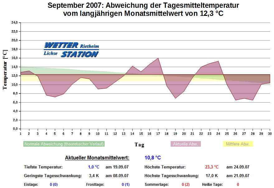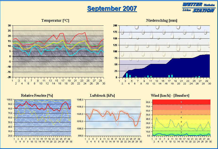*************************************************** ************** T E M P E R A T U R ************** *************************************************** Mittlere Temperatur: 10,8 °C MIN Temperatur: 1,0 °C am 19.09.07 MAX Temperatur: 23,3 °C am 24.09.07 Mittlere MIN Temperatur: 6,1 °C Mittlere MAX Temperatur: 15,7 °C MIN Temp Delta : 3,4 K am 08.09.07 MAX Temp Delta : 17,0 K am 21.09.07 Mittl. Temp Delta: 9,6 K Starkfrosttage : 0 Eistage : 0 Frosttage : 0 Sommertage : 0 Heiße Tage : 0 *************************************************** ************ N I E D E R S C H L A G ************ *************************************************** Ges. Niederschlagsmenge: 88,4 mm MAX Niederschlag/Stunde: 9,7 mm am 17.09.07 MAX Niederschlag/Tag: 17,0 mm am 03.09.07 MAX Niederschlag in 24h: 19,8 mm am 18.09.07 MAX Niederschlag Rate: 77,7 mm/h am 17.09.07 Niederschlag an 22 Tagen Regentage (> 1mm) : 12 Regentage (> 3mm) : 10 Regentage (> 10mm) : 3 Regentage (> 20mm) : 0 *************************************************** ******************** W I N D ******************** *************************************************** Mittlere Windgeschwindigkeit: 0,7 m/s = 2,6 km/h Hauptwindrichtung: NW Maximale Windgeschwindigkeit: 12,1 m/s = 43,5 km/h aus N am 03.09.07 Prozentuale Verteilung Windgeschwindigkeit: Bft_0 (bis 0,9 km/h) : 40.82 % Bft_1 (bis 5,6 km/h) : 42.20 % Bft_2 (bis 12 km/h) : 16.05 % Bft_3 (bis 20 km/h) : 0.93 % Prozentuale Verteilung Windrichtung: N : 38.4 % NNO : 1.2 % NO : 0.4 % ONO : 0.1 % O : 0.5 % OSO : 3.3 % SO : 1.0 % SSO : 3.6 % S : 0.9 % SSW : 10.9 % SW : 3.1 % WSW : 9.6 % W : 11.0 % WNW : 2.1 % NW : 7.6 % NNW : 6.3 % *************************************************** *************** L U F T D R U C K *************** *************************************************** Mittlerer Luftdruck: 1018,6 hPa MIN Luftdruck: 1002,0 hPa am 27.09.07 MAX Luftdruck: 1028,2 hPa am 05.09.07 *************************************************** ************ L U F T F E U C H T E ************** *************************************************** Mittlere rel. Luftfeuchte: 84,6 % MIN rel. Luftfeuchte: 44,0 % am 21.09.07 MAX rel. Luftfeuchte: 99,0 %