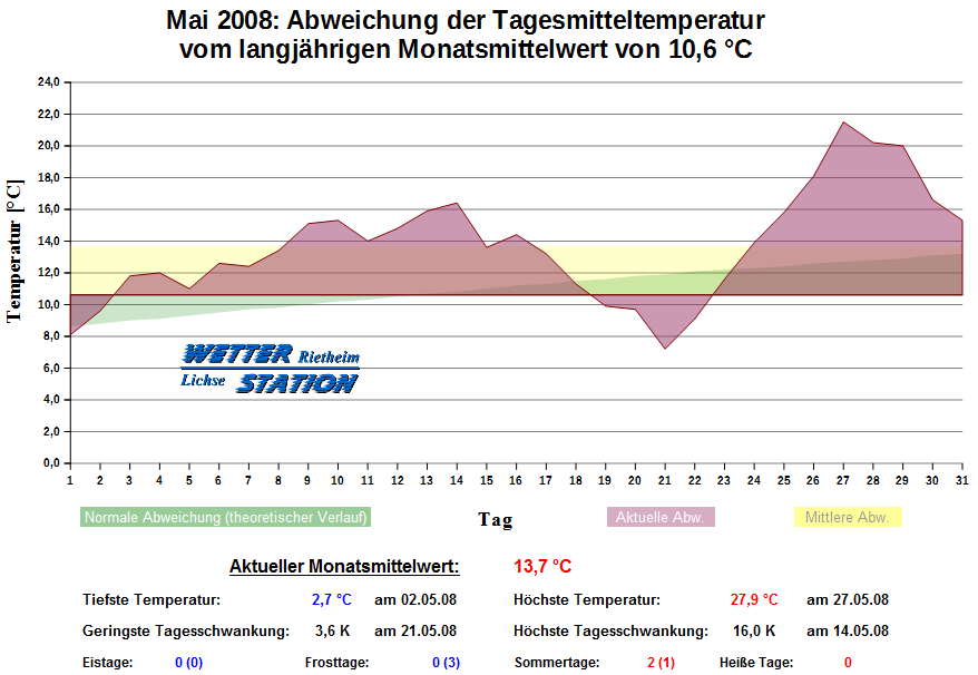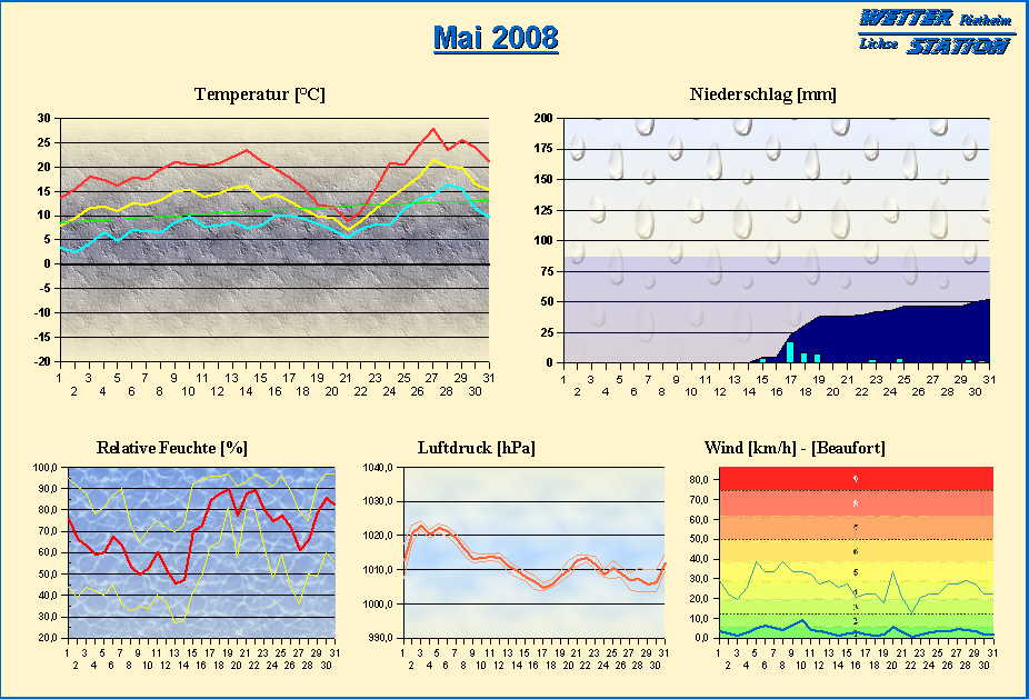 *************************************************** ************** T E M P E R A T U R ************** *************************************************** Mittlere Temperatur: 13,7 °C MIN Temperatur: 2,7 °C am 02.05.08 MAX Temperatur: 27,9 °C am 27.05.08 Mittlere MIN Temperatur: 8,7 °C Mittlere MAX Temperatur: 19,0 °C MIN Temp Delta : 3,6 K am 21.05.08 MAX Temp Delta : 16,0 K am 14.05.08 Mittl. Temp Delta: 10,3 K Starkfrosttage : 0 Eistage : 0 Frosttage : 0 Sommertage : 2 Heiße Tage : 0 *************************************************** ************ N I E D E R S C H L A G ************ *************************************************** Ges. Niederschlagsmenge: 52,1 mm MAX Niederschlag/Stunde: 6,1 mm am 17.05.08 MAX Niederschlag/Tag: 18,0 mm am 17.05.08 MAX Niederschlag in 24h: 20,6 mm am 18.05.08 MAX Niederschlag Rate: 31,5 mm/h am 15.05.08 Niederschlag an 12 Tagen Regentage (> 1mm) : 8 Regentage (> 3mm) : 6 Regentage (> 10mm) : 1 Regentage (> 20mm) : 0 *************************************************** ******************** W I N D ******************** *************************************************** Mittlere Windgeschwindigkeit: 1,0 m/s = 3,7 km/h Hauptwindrichtung: O Maximale Windgeschwindigkeit: 10,7 m/s = 38,6 km/h aus O am 05.05.08 Prozentuale Verteilung Windgeschwindigkeit: Bft_0 (bis 0,9 km/h) : 32.35 % Bft_1 (bis 5,6 km/h) : 39.85 % Bft_2 (bis 12 km/h) : 24.84 % Bft_3 (bis 20 km/h) : 2.96 % Prozentuale Verteilung Windrichtung: N : 9.2 % NNO : 3.0 % NO : 10.5 % ONO : 4.6 % O : 17.0 % OSO : 33.8 % SO : 2.0 % SSO : 4.9 % S : 0.7 % SSW : 6.4 % SW : 1.3 % WSW : 2.2 % W : 2.1 % WNW : 0.3 % NW : 1.0 % NNW : 0.9 % *************************************************** *************** L U F T D R U C K *************** *************************************************** Mittlerer Luftdruck: 1012,3 hPa MIN Luftdruck: 1003,4 hPa am 30.05.08 MAX Luftdruck: 1024,3 hPa am 03.05.08 *************************************************** ************ L U F T F E U C H T E ************** *************************************************** Mittlere rel. Luftfeuchte: 69,7 % MIN rel. Luftfeuchte: 27,0 % am 13.05.08 MAX rel. Luftfeuchte: 97,0 %