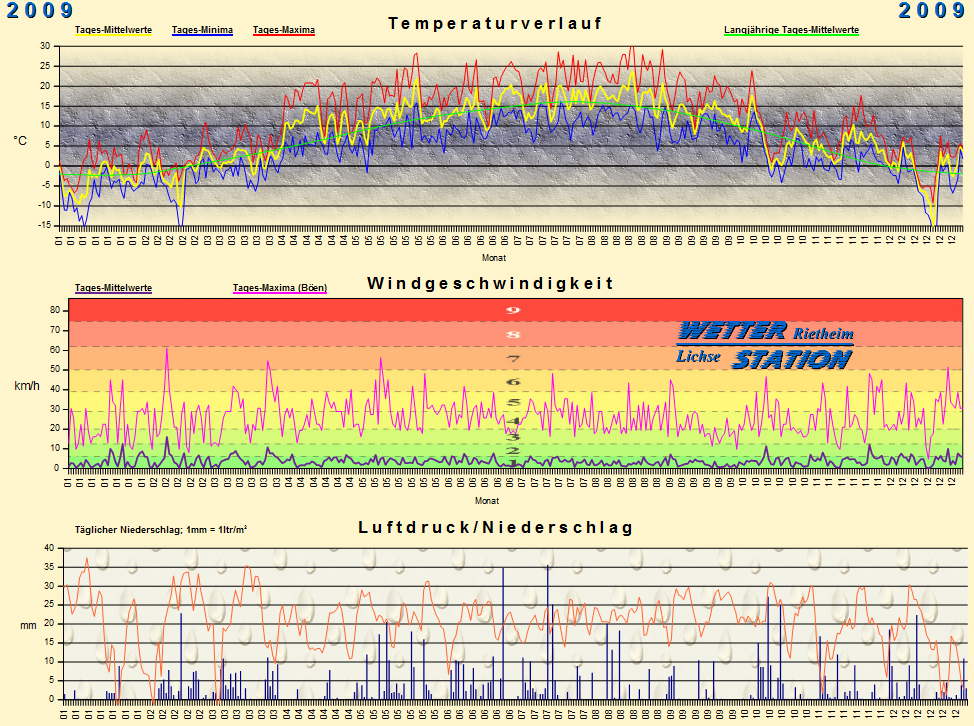 *************************************************** ************** T E M P E R A T U R ************** *************************************************** Mittlere Temperatur: 7,8 °C MIN Temperatur: -22,9 °C am 20.12.09 MAX Temperatur: 32,3 °C am 20.08.09 Mittlere MIN Temperatur: 3,6 °C Mittlere MAX Temperatur: 12,3 °C MIN Temp Delta : 1,1 K am 23.06.09 MAX Temp Delta : 20,1 K am 20.12.09 Mittl. Temp Delta: 8,7 K Starkfrosttage : 16 Eistage : 33 Frosttage : 120 Sommertage : 23 Heiße Tage : 1 *************************************************** ************ N I E D E R S C H L A G ************ *************************************************** Ges. Niederschlagsmenge: 1018,8 mm MAX Niederschlag/Stunde: 15,2 mm am 13.08.09 MAX Niederschlag/Tag: 35,6 mm am 15.07.09 MAX Niederschlag in 24h: 38,6 mm am 15.07.09 MAX Niederschlag Rate: 192,5 mm/h am 13.08.09 Niederschlag an 189 Tagen Regentage (> 1mm) : 151 Regentage (> 3mm) : 99 Regentage (> 10mm) : 30 Regentage (> 20mm) : 9 Längste Niederschlagsperiode: 11 Tage vom 05.03.09 bis zum 15.03.09 Längste Trockenperiode: 12 Tage vom 27.01.09 bis zum 07.02.09 *************************************************** ******************** W I N D ******************** *************************************************** Mittlere Windgeschwindigkeit: 1,0 m/s = 3,5 km/h Hauptwindrichtung: SW Maximale Windgeschwindigkeit: 17,0 m/s = 61,2 km/h aus N am 10.02.09 Prozentuale Verteilung Windgeschwindigkeit: Bft_0 (bis 0,9 km/h) : 33.60 % Bft_1 (bis 5,6 km/h) : 40.18 % Bft_2 (bis 12 km/h) : 23.21 % Bft_3 (bis 20 km/h) : 2.90 % Bft_4 (bis 29 km/h) : 0.11 % Prozentuale Verteilung Windrichtung: N : 17.4 % NNO : 1.7 % NO : 3.3 % ONO : 0.8 % O : 3.6 % OSO : 9.4 % SO : 2.0 % SSO : 7.3 % S : 1.5 % SSW : 20.1 % SW : 5.8 % WSW : 8.7 % W : 9.8 % WNW : 1.7 % NW : 3.6 % NNW : 3.4 % *************************************************** *************** L U F T D R U C K *************** *************************************************** Mittlerer Luftdruck: 1015,5 hPa MIN Luftdruck: 976,4 hPa am 23.01.09 MAX Luftdruck: 1037,5 hPa am 11.01.09 Grösster Luftdruck-Anstieg innerhalb 24 Stunden: 25.6 hPa am 26.12.09 Grösster Luftdruck-Abfall innerhalb 24 Stunden: -28.1 hPa am 23.01.09 *************************************************** ************ L U F T F E U C H T E ************** *************************************************** Mittlere rel. Luftfeuchte: 82,7 % MIN rel. Luftfeuchte: 26,0 % am 18.03.09 MAX rel. Luftfeuchte: 100,0 %
