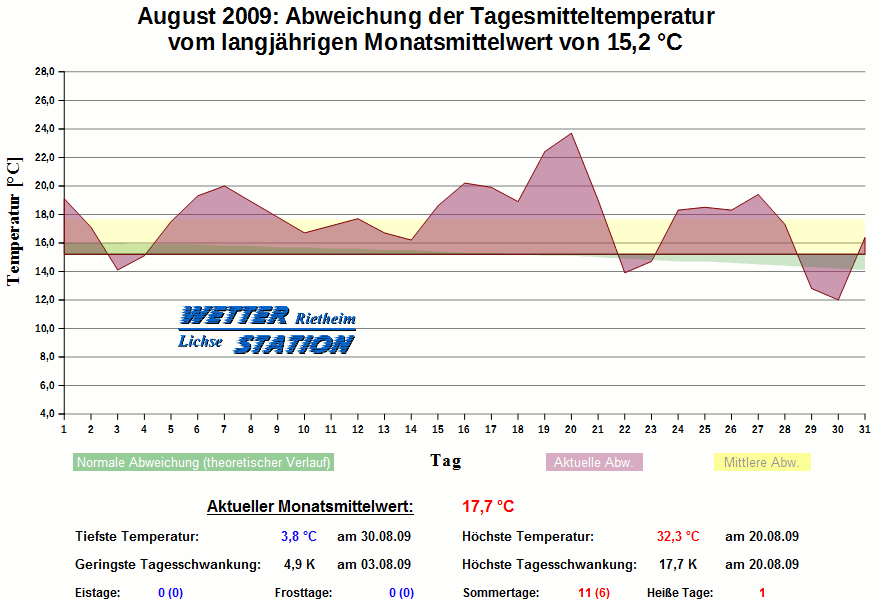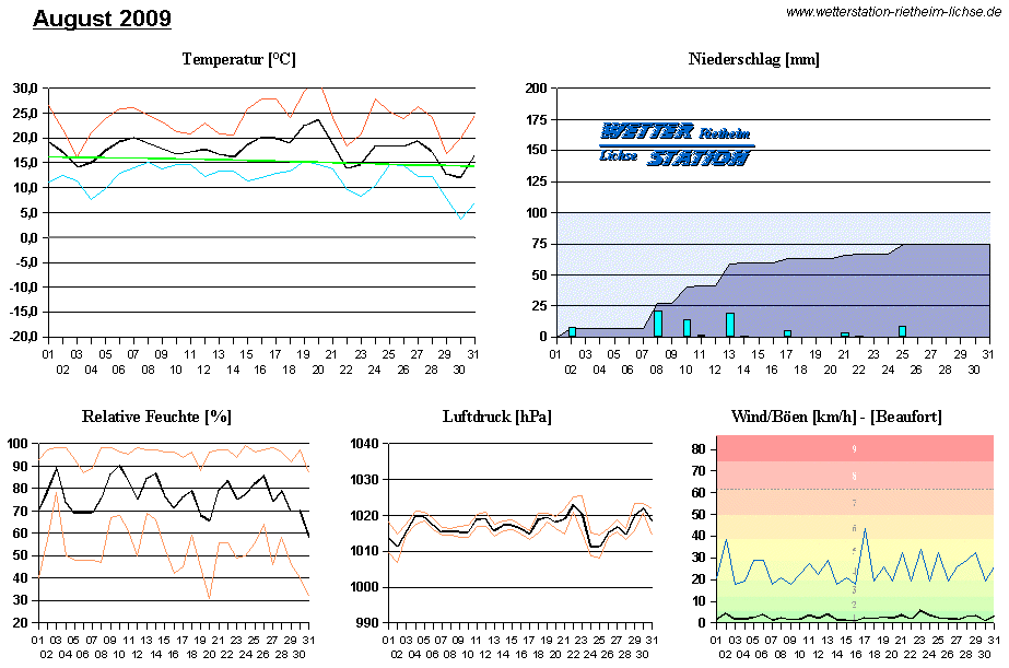 *************************************************** ************** T E M P E R A T U R ************** *************************************************** Mittlere Temperatur: 17,7 °C MIN Temperatur: 3,8 °C am 30.08.09 MAX Temperatur: 32,3 °C am 20.08.09 Mittlere MIN Temperatur: 11,9 °C Mittlere MAX Temperatur: 23,7 °C MIN Temp Delta : 4,9 K am 03.08.09 MAX Temp Delta : 17,7 K am 20.08.09 Mittl. Temp Delta: 11,8 K Starkfrosttage : 0 Eistage : 0 Frosttage : 0 Sommertage : 11 Heiße Tage : 1 *************************************************** ************ N I E D E R S C H L A G ************ *************************************************** Ges. Niederschlagsmenge: 74,7 mm MAX Niederschlag/Stunde: 15,2 mm am 13.08.09 MAX Niederschlag/Tag: 20,1 mm am 08.08.09 MAX Niederschlag in 24h: 20,1 mm am 08.08.09 MAX Niederschlag Rate: 192,5 mm/h am 13.08.09 Niederschlag an 10 Tagen Regentage (> 1mm) : 7 Regentage (> 3mm) : 6 Regentage (> 10mm) : 3 Regentage (> 20mm) : 1 *************************************************** ******************** W I N D ******************** *************************************************** Mittlere Windgeschwindigkeit: 0,7 m/s = 2,5 km/h Hauptwindrichtung: S Maximale Windgeschwindigkeit: 12,1 m/s = 43,5 km/h aus SW am 17.08.09 Prozentuale Verteilung Windgeschwindigkeit: Bft_0 (bis 0,9 km/h) : 45.71 % Bft_1 (bis 5,6 km/h) : 37.34 % Bft_2 (bis 12 km/h) : 15.56 % Bft_3 (bis 20 km/h) : 1.39 % Prozentuale Verteilung Windrichtung: N : 20.6 % NNO : 1.6 % NO : 1.9 % ONO : 1.1 % O : 5.1 % OSO : 14.4 % SO : 5.2 % SSO : 7.0 % S : 1.8 % SSW : 13.4 % SW : 3.7 % WSW : 4.9 % W : 8.8 % WNW : 2.2 % NW : 4.0 % NNW : 4.5 % *************************************************** *************** L U F T D R U C K *************** *************************************************** Mittlerer Luftdruck: 1017,0 hPa MIN Luftdruck: 1006,8 hPa am 02.08.09 MAX Luftdruck: 1025,4 hPa am 23.08.09 *************************************************** ************ L U F T F E U C H T E ************** *************************************************** Mittlere rel. Luftfeuchte: 76,4 % MIN rel. Luftfeuchte: 31,0 % am 20.08.09 MAX rel. Luftfeuchte: 99,0 %