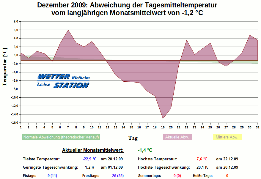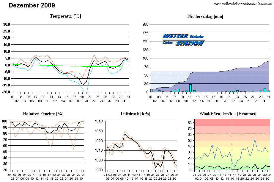 *************************************************** ************** T E M P E R A T U R ************** *************************************************** Mittlere Temperatur: -1,4 °C MIN Temperatur: -22,9 °C am 20.12.09 MAX Temperatur: 7,6 °C am 22.12.09 Mittlere MIN Temperatur: -4,3 °C Mittlere MAX Temperatur: 1,4 °C MIN Temp Delta : 1,2 K am 01.12.09 MAX Temp Delta : 20,1 K am 20.12.09 Mittl. Temp Delta: 5,8 K Starkfrosttage : 5 Eistage : 9 Frosttage : 25 Sommertage : 0 Heiße Tage : 0 *************************************************** ************ N I E D E R S C H L A G ************ *************************************************** Ges. Niederschlagsmenge: 91,7 mm MAX Niederschlag/Stunde: 3,0 mm am 11.12.09 MAX Niederschlag/Tag: 22,4 mm am 11.12.09 MAX Niederschlag in 24h: 23,6 mm am 12.12.09 MAX Niederschlag Rate: 7,6 mm/h am 08.12.09 Niederschlag an 23 Tagen Regentage (> 1mm) : 16 Regentage (> 3mm) : 11 Regentage (> 10mm) : 2 Regentage (> 20mm) : 1 *************************************************** ******************** W I N D ******************** *************************************************** Mittlere Windgeschwindigkeit: 1,2 m/s = 4,4 km/h Hauptwindrichtung: SSW Maximale Windgeschwindigkeit: 14,3 m/s = 51,5 km/h aus SW am 25.12.09 Prozentuale Verteilung Windgeschwindigkeit: Bft_0 (bis 0,9 km/h) : 24.84 % Bft_1 (bis 5,6 km/h) : 40.43 % Bft_2 (bis 12 km/h) : 30.52 % Bft_3 (bis 20 km/h) : 4.16 % Bft_4 (bis 29 km/h) : 0.04 % Prozentuale Verteilung Windrichtung: N : 5.7 % NNO : 0.8 % NO : 3.5 % ONO : 1.3 % O : 4.5 % OSO : 3.6 % SO : 1.6 % SSO : 10.0 % S : 1.2 % SSW : 42.6 % SW : 4.6 % WSW : 7.6 % W : 8.3 % WNW : 1.0 % NW : 2.1 % NNW : 1.6 % *************************************************** *************** L U F T D R U C K *************** *************************************************** Mittlerer Luftdruck: 1009,8 hPa MIN Luftdruck: 984,5 hPa am 24.12.09 MAX Luftdruck: 1029,5 hPa am 09.12.09 *************************************************** ************ L U F T F E U C H T E ************** *************************************************** Mittlere rel. Luftfeuchte: 91,2 % MIN rel. Luftfeuchte: 53,0 % am 27.12.09 MAX rel. Luftfeuchte: 100,0 %