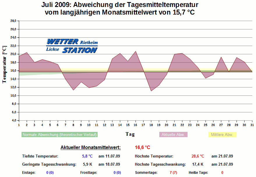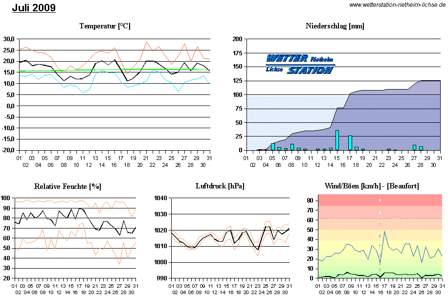 *************************************************** ************** T E M P E R A T U R ************** *************************************************** Mittlere Temperatur: 16,6 °C MIN Temperatur: 5,8 °C am 11.07.09 MAX Temperatur: 28,6 °C am 21.07.09 Mittlere MIN Temperatur: 11,5 °C Mittlere MAX Temperatur: 22,0 °C MIN Temp Delta : 5,9 K am 18.07.09 MAX Temp Delta : 17,4 K am 21.07.09 Mittl. Temp Delta: 10,5 K Starkfrosttage : 0 Eistage : 0 Frosttage : 0 Sommertage : 7 Heiße Tage : 0 *************************************************** ************ N I E D E R S C H L A G ************ *************************************************** Ges. Niederschlagsmenge: 125,5 mm MAX Niederschlag/Stunde: 9,1 mm am 05.07.09 MAX Niederschlag/Tag: 35,6 mm am 15.07.09 MAX Niederschlag in 24h: 38,6 mm am 15.07.09 MAX Niederschlag Rate: 53,3 mm/h am 05.07.09 Niederschlag an 19 Tagen Regentage (> 1mm) : 17 Regentage (> 3mm) : 10 Regentage (> 10mm) : 4 Regentage (> 20mm) : 2 *************************************************** ******************** W I N D ******************** *************************************************** Mittlere Windgeschwindigkeit: 0,9 m/s = 3,3 km/h Hauptwindrichtung: WSW Maximale Windgeschwindigkeit: 13,4 m/s = 48,3 km/h aus W am 17.07.09 Prozentuale Verteilung Windgeschwindigkeit: Bft_0 (bis 0,9 km/h) : 34.43 % Bft_1 (bis 5,6 km/h) : 40.86 % Bft_2 (bis 12 km/h) : 23.04 % Bft_3 (bis 20 km/h) : 1.65 % Bft_4 (bis 29 km/h) : 0.02 % Prozentuale Verteilung Windrichtung: N : 14.5 % NNO : 1.2 % NO : 1.9 % ONO : 0.3 % O : 0.8 % OSO : 3.7 % SO : 0.7 % SSO : 6.7 % S : 2.5 % SSW : 19.1 % SW : 8.0 % WSW : 11.1 % W : 16.8 % WNW : 3.7 % NW : 4.7 % NNW : 4.4 % *************************************************** *************** L U F T D R U C K *************** *************************************************** Mittlerer Luftdruck: 1015,3 hPa MIN Luftdruck: 1003,7 hPa am 23.07.09 MAX Luftdruck: 1025,6 hPa am 25.07.09 *************************************************** ************ L U F T F E U C H T E ************** *************************************************** Mittlere rel. Luftfeuchte: 77,6 % MIN rel. Luftfeuchte: 34,0 % am 27.07.09 MAX rel. Luftfeuchte: 98,0 %