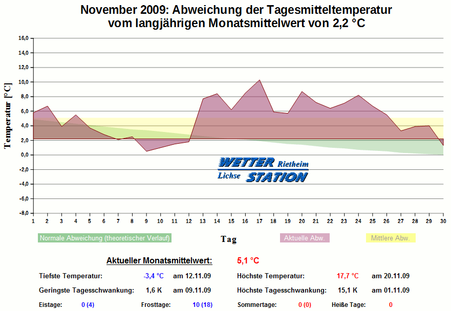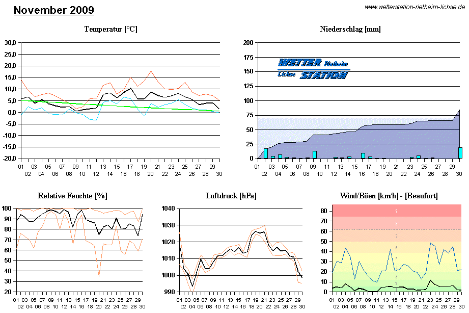 *************************************************** ************** T E M P E R A T U R ************** *************************************************** Mittlere Temperatur: 5,1 °C MIN Temperatur: -3,4 °C am 12.11.09 MAX Temperatur: 17,7 °C am 20.11.09 Mittlere MIN Temperatur: 1,5 °C Mittlere MAX Temperatur: 9,0 °C MIN Temp Delta : 1,6 K am 09.11.09 MAX Temp Delta : 15,1 K am 01.11.09 Mittl. Temp Delta: 7,4 K Starkfrosttage : 0 Eistage : 0 Frosttage : 10 Sommertage : 0 Heiße Tage : 0 *************************************************** ************ N I E D E R S C H L A G ************ *************************************************** Ges. Niederschlagsmenge: 84,1 mm MAX Niederschlag/Stunde: 3,0 mm am 02.11.09 MAX Niederschlag/Tag: 18,5 mm am 30.11.09 MAX Niederschlag in 24h: 18,5 mm am 30.11.09 MAX Niederschlag Rate: 14,0 mm/h am 02.11.09 Niederschlag an 15 Tagen Regentage (> 1mm) : 13 Regentage (> 3mm) : 7 Regentage (> 10mm) : 3 Regentage (> 20mm) : 0 *************************************************** ******************** W I N D ******************** *************************************************** Mittlere Windgeschwindigkeit: 1,2 m/s = 4,1 km/h Hauptwindrichtung: SW Maximale Windgeschwindigkeit: 13,4 m/s = 48,3 km/h aus SW am 23.11.09 Prozentuale Verteilung Windgeschwindigkeit: Bft_0 (bis 0,9 km/h) : 25.96 % Bft_1 (bis 5,6 km/h) : 43.07 % Bft_2 (bis 12 km/h) : 26.56 % Bft_3 (bis 20 km/h) : 4.28 % Bft_4 (bis 29 km/h) : 0.13 % Prozentuale Verteilung Windrichtung: N : 4.2 % NNO : 0.6 % NO : 0.5 % ONO : 0.0 % O : 0.0 % OSO : 0.5 % SO : 0.7 % SSO : 7.3 % S : 2.1 % SSW : 47.4 % SW : 13.8 % WSW : 14.8 % W : 6.3 % WNW : 0.4 % NW : 0.7 % NNW : 0.5 % *************************************************** *************** L U F T D R U C K *************** *************************************************** Mittlerer Luftdruck: 1011,9 hPa MIN Luftdruck: 987,9 hPa am 04.11.09 MAX Luftdruck: 1029,8 hPa am 21.11.09 *************************************************** ************ L U F T F E U C H T E ************** *************************************************** Mittlere rel. Luftfeuchte: 88,8 % MIN rel. Luftfeuchte: 35,0 % am 20.11.09 MAX rel. Luftfeuchte: 100,0 %