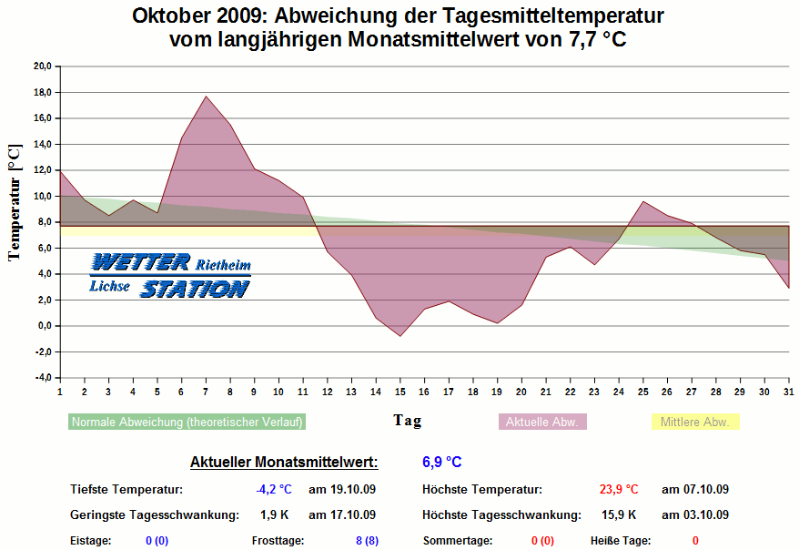 *************************************************** ************** T E M P E R A T U R ************** *************************************************** Mittlere Temperatur: 6,9 °C MIN Temperatur: -4,2 °C am 19.10.09 MAX Temperatur: 23,9 °C am 07.10.09 Mittlere MIN Temperatur: 3,4 °C Mittlere MAX Temperatur: 11,0 °C MIN Temp Delta : 1,9 K am 17.10.09 MAX Temp Delta : 15,9 K am 03.10.09 Mittl. Temp Delta: 7,6 K Starkfrosttage : 0 Eistage : 0 Frosttage : 8 Sommertage : 0 Heiße Tage : 0 *************************************************** ************ N I E D E R S C H L A G ************ *************************************************** Ges. Niederschlagsmenge: 112,8 mm MAX Niederschlag/Stunde: 9,4 mm am 12.10.09 MAX Niederschlag/Tag: 27,2 mm am 12.10.09 MAX Niederschlag in 24h: 27,7 mm am 12.10.09 MAX Niederschlag Rate: 42,2 mm/h am 12.10.09 Niederschlag an 15 Tagen Regentage (> 1mm) : 11 Regentage (> 3mm) : 9 Regentage (> 10mm) : 3 Regentage (> 20mm) : 2 *************************************************** ******************** W I N D ******************** *************************************************** Mittlere Windgeschwindigkeit: 1,0 m/s = 3,5 km/h Hauptwindrichtung: WSW Maximale Windgeschwindigkeit: 13,0 m/s = 46,7 km/h aus NO am 12.10.09 Prozentuale Verteilung Windgeschwindigkeit: Bft_0 (bis 0,9 km/h) : 30.23 % Bft_1 (bis 5,6 km/h) : 45.39 % Bft_2 (bis 12 km/h) : 21.68 % Bft_3 (bis 20 km/h) : 2.68 % Bft_4 (bis 29 km/h) : 0.02 % Prozentuale Verteilung Windrichtung: N : 23.3 % NNO : 0.9 % NO : 0.4 % ONO : 0.1 % O : 1.4 % OSO : 12.4 % SO : 2.8 % SSO : 10.4 % S : 1.9 % SSW : 14.2 % SW : 6.0 % WSW : 5.8 % W : 7.3 % WNW : 1.7 % NW : 5.9 % NNW : 5.6 % *************************************************** *************** L U F T D R U C K *************** *************************************************** Mittlerer Luftdruck: 1018,2 hPa MIN Luftdruck: 1000,5 hPa am 22.10.09 MAX Luftdruck: 1029,2 hPa am 14.10.09 *************************************************** ************ L U F T F E U C H T E ************** *************************************************** Mittlere rel. Luftfeuchte: 88,9 % MIN rel. Luftfeuchte: 49,0 % am 21.10.09 MAX rel. Luftfeuchte: 100,0 %