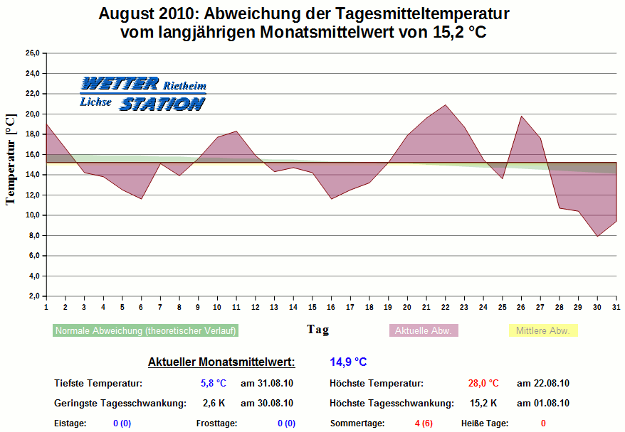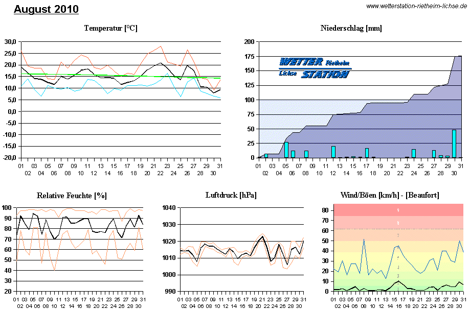 *************************************************** ************** T E M P E R A T U R ************** *************************************************** Mittlere Temperatur: 14,9 °C MIN Temperatur: 5,8 °C am 31.08.10 MAX Temperatur: 28,0 °C am 22.08.10 Mittlere MIN Temperatur: 10,5 °C Mittlere MAX Temperatur: 19,4 °C MIN Temp Delta : 2,6 K am 30.08.10 MAX Temp Delta : 15,2 K am 01.08.10 Mittl. Temp Delta: 9,0 K Starkfrosttage : 0 Eistage : 0 Frosttage : 0 Sommertage : 4 Heiße Tage : 0 *************************************************** ************ N I E D E R S C H L A G ************ *************************************************** Ges. Niederschlagsmenge: 175,5 mm MAX Niederschlag/Stunde: 15,7 mm am 30.08.10 MAX Niederschlag/Tag: 47,8 mm am 30.08.10 MAX Niederschlag in 24h: 48,0 mm am 30.08.10 MAX Niederschlag Rate: 215,1 mm/h am 08.08.10 Niederschlag an 19 Tagen Regentage (> 1mm) : 14 Regentage (> 3mm) : 10 Regentage (> 10mm) : 8 Regentage (> 20mm) : 2 *************************************************** ******************** W I N D ******************** *************************************************** Mittlere Windgeschwindigkeit: 1,0 m/s = 3,5 km/h Effektive Windrichtung: W Maximale Windgeschwindigkeit: 14,3 m/s = 51,5 km/h aus NW am 08.08.10 Prozentuale Verteilung Windgeschwindigkeit: Bft_0 (bis 0,9 km/h) : 36.42 % Bft_1 (bis 5,6 km/h) : 37.02 % Bft_2 (bis 12 km/h) : 22.24 % Bft_3 (bis 20 km/h) : 4.20 % Bft_4 (bis 29 km/h) : 0.11 % Prozentuale Verteilung Windrichtung: N : 20.2 % NNO : 1.1 % NO : 1.7 % ONO : 0.3 % O : 1.0 % OSO : 1.4 % SO : 2.1 % SSO : 0.3 % S : 1.0 % SSW : 29.7 % SW : 6.5 % WSW : 10.8 % W : 11.6 % WNW : 2.2 % NW : 4.2 % NNW : 5.8 % *************************************************** *************** L U F T D R U C K *************** *************************************************** Mittlerer Luftdruck: 1014,3 hPa MIN Luftdruck: 1003,5 hPa am 27.08.10 MAX Luftdruck: 1024,5 hPa am 21.08.10 *************************************************** ************ L U F T F E U C H T E ************** *************************************************** Mittlere rel. Luftfeuchte: 83,0 % MIN rel. Luftfeuchte: 40,0 % am 10.08.10 MAX rel. Luftfeuchte: 99,0 %