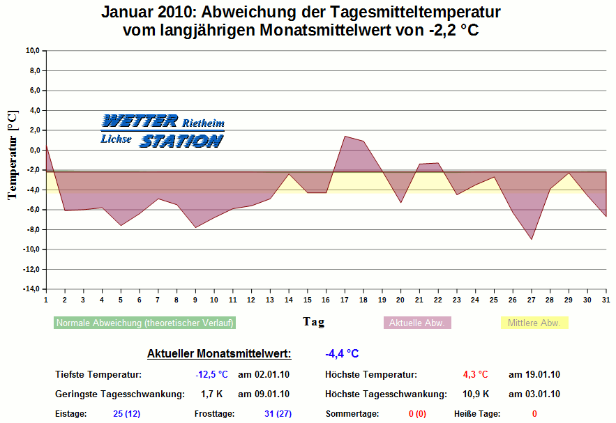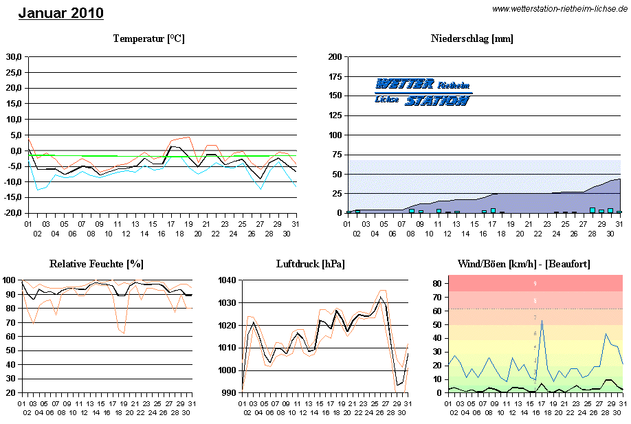 *************************************************** ************** T E M P E R A T U R ************** *************************************************** Mittlere Temperatur: -4,4 °C MIN Temperatur: -12,5 °C am 02.01.10 MAX Temperatur: 4,3 °C am 19.01.10 Mittlere MIN Temperatur: -6,8 °C Mittlere MAX Temperatur: -1,9 °C MIN Temp Delta : 1,7 K am 09.01.10 MAX Temp Delta : 10,9 K am 03.01.10 Mittl. Temp Delta: 4,9 K Starkfrosttage : 4 Eistage : 25 Frosttage : 31 Sommertage : 0 Heiße Tage : 0 *************************************************** ************ N I E D E R S C H L A G ************ *************************************************** Ges. Niederschlagsmenge: 43,9 mm MAX Niederschlag/Stunde: 1,5 mm am 16.01.10 MAX Niederschlag/Tag: 6,1 mm am 28.01.10 MAX Niederschlag in 24h: 7,1 mm am 17.01.10 MAX Niederschlag Rate: 3,0 mm/h am 02.01.10 Niederschlag an 17 Tagen Regentage (> 1mm) : 13 Regentage (> 3mm) : 6 Regentage (> 10mm) : 0 Regentage (> 20mm) : 0 *************************************************** ******************** W I N D ******************** *************************************************** Mittlere Windgeschwindigkeit: 0,8 m/s = 2,9 km/h Effektive Windrichtung: SSW Maximale Windgeschwindigkeit: 14,8 m/s = 53,1 km/h aus N am 17.01.10 Prozentuale Verteilung Windgeschwindigkeit: Bft_0 (bis 0,9 km/h) : 34.82 % Bft_1 (bis 5,6 km/h) : 47.63 % Bft_2 (bis 12 km/h) : 15.14 % Bft_3 (bis 20 km/h) : 2.41 % Prozentuale Verteilung Windrichtung: N : 14.1 % NNO : 2.3 % NO : 1.8 % ONO : 0.2 % O : 3.4 % OSO : 15.3 % SO : 1.8 % SSO : 10.8 % S : 0.9 % SSW : 17.8 % SW : 4.1 % WSW : 10.8 % W : 10.1 % WNW : 1.1 % NW : 2.3 % NNW : 3.1 % *************************************************** *************** L U F T D R U C K *************** *************************************************** Mittlerer Luftdruck: 1014,9 hPa MIN Luftdruck: 984,5 hPa am 29.01.10 MAX Luftdruck: 1035,5 hPa am 27.01.10 *************************************************** ************ L U F T F E U C H T E ************** *************************************************** Mittlere rel. Luftfeuchte: 93,7 % MIN rel. Luftfeuchte: 62,0 % am 19.01.10 MAX rel. Luftfeuchte: 100,0 %