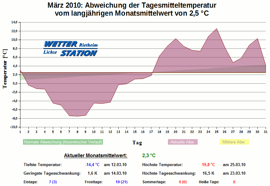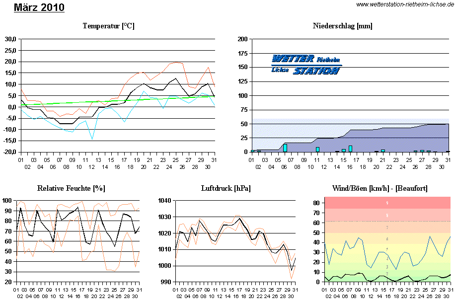 *************************************************** ************** T E M P E R A T U R ************** *************************************************** Mittlere Temperatur: 2,3 °C MIN Temperatur: -14,4 °C am 12.03.10 MAX Temperatur: 19,8 °C am 25.03.10 Mittlere MIN Temperatur: -1,9 °C Mittlere MAX Temperatur: 7,1 °C MIN Temp Delta : 1,6 K am 14.03.10 MAX Temp Delta : 16,5 K am 23.03.10 Mittl. Temp Delta: 8,9 K Starkfrosttage : 3 Eistage : 7 Frosttage : 19 Sommertage : 0 Heiße Tage : 0 *************************************************** ************ N I E D E R S C H L A G ************ *************************************************** Ges. Niederschlagsmenge: 49,8 mm MAX Niederschlag/Stunde: 2,3 mm am 06.03.10 MAX Niederschlag/Tag: 13,0 mm am 06.03.10 MAX Niederschlag in 24h: 13,0 mm am 06.03.10 MAX Niederschlag Rate: 8,9 mm/h am 21.03.10 Niederschlag an 14 Tagen Regentage (> 1mm) : 11 Regentage (> 3mm) : 5 Regentage (> 10mm) : 2 Regentage (> 20mm) : 0 *************************************************** ******************** W I N D ******************** *************************************************** Mittlere Windgeschwindigkeit: 1,3 m/s = 4,6 km/h Effektive Windrichtung: WSW Maximale Windgeschwindigkeit: 13,0 m/s = 46,7 km/h aus W am 26.03.10 Prozentuale Verteilung Windgeschwindigkeit: Bft_0 (bis 0,9 km/h) : 23.72 % Bft_1 (bis 5,6 km/h) : 38.96 % Bft_2 (bis 12 km/h) : 31.99 % Bft_3 (bis 20 km/h) : 5.17 % Bft_4 (bis 29 km/h) : 0.16 % Prozentuale Verteilung Windrichtung: N : 7.9 % NNO : 2.5 % NO : 13.4 % ONO : 2.0 % O : 7.8 % OSO : 7.0 % SO : 1.1 % SSO : 2.3 % S : 1.2 % SSW : 15.0 % SW : 6.8 % WSW : 16.4 % W : 10.8 % WNW : 1.4 % NW : 2.5 % NNW : 1.9 % *************************************************** *************** L U F T D R U C K *************** *************************************************** Mittlerer Luftdruck: 1017,6 hPa MIN Luftdruck: 991,9 hPa am 30.03.10 MAX Luftdruck: 1030,9 hPa am 16.03.10 *************************************************** ************ L U F T F E U C H T E ************** *************************************************** Mittlere rel. Luftfeuchte: 76,0 % MIN rel. Luftfeuchte: 31,0 % am 25.03.10 MAX rel. Luftfeuchte: 99,0 %