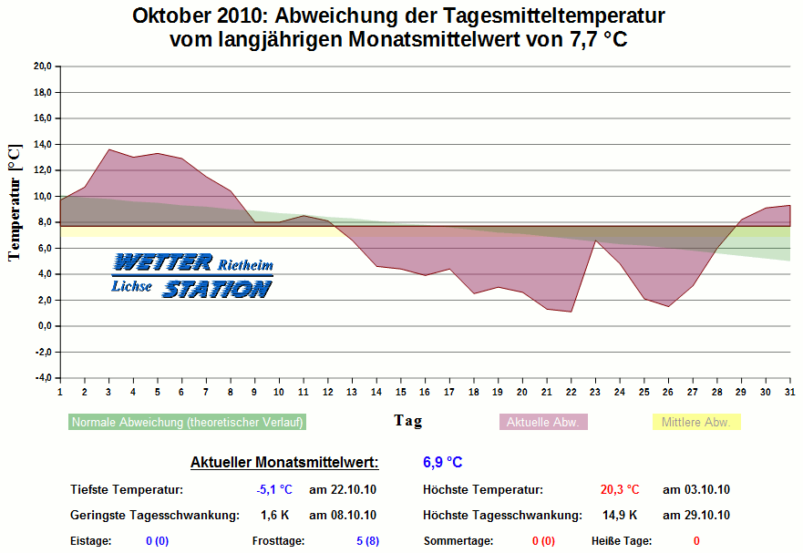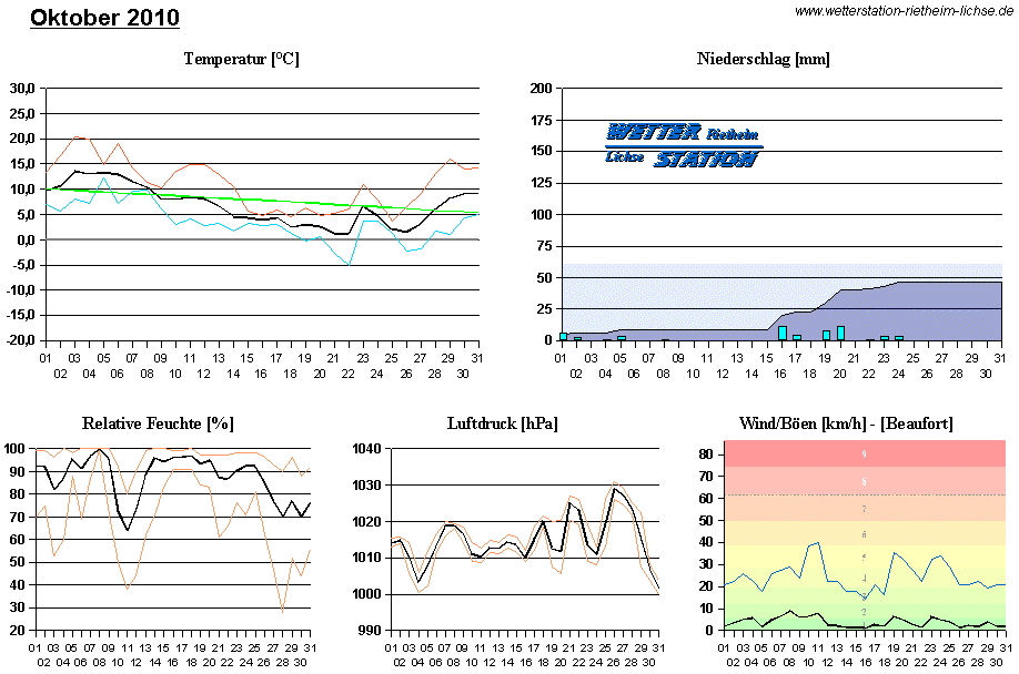 *************************************************** ************** T E M P E R A T U R ************** *************************************************** Mittlere Temperatur: 6,9 °C MIN Temperatur: -5,1 °C am 22.10.10 MAX Temperatur: 20,3 °C am 03.10.10 Mittlere MIN Temperatur: 3,4 °C Mittlere MAX Temperatur: 11,1 °C MIN Temp Delta : 1,6 K am 08.10.10 MAX Temp Delta : 14,9 K am 29.10.10 Mittl. Temp Delta: 7,7 K Starkfrosttage : 0 Eistage : 0 Frosttage : 5 Sommertage : 0 Heiße Tage : 0 *************************************************** ************ N I E D E R S C H L A G ************ *************************************************** Ges. Niederschlagsmenge: 46,2 mm MAX Niederschlag/Stunde: 2,8 mm am 19.10.10 MAX Niederschlag/Tag: 10,9 mm am 16.10.10 MAX Niederschlag in 24h: 11,9 mm am 20.10.10 MAX Niederschlag Rate: 8,9 mm/h am 19.10.10 Niederschlag an 9 Tagen Regentage (> 1mm) : 9 Regentage (> 3mm) : 5 Regentage (> 10mm) : 2 Regentage (> 20mm) : 0 *************************************************** ******************** W I N D ******************** *************************************************** Mittlere Windgeschwindigkeit: 1,0 m/s = 3,7 km/h Effektive Windrichtung: SSO Maximale Windgeschwindigkeit: 11,2 m/s = 40,2 km/h aus OSO am 11.10.10 Prozentuale Verteilung Windgeschwindigkeit: Bft_0 (bis 0,9 km/h) : 29.47 % Bft_1 (bis 5,6 km/h) : 43.35 % Bft_2 (bis 12 km/h) : 23.49 % Bft_3 (bis 20 km/h) : 3.70 % Prozentuale Verteilung Windrichtung: N : 7.3 % NNO : 2.5 % NO : 4.2 % ONO : 0.9 % O : 5.1 % OSO : 18.4 % SO : 20.6 % SSO : 1.8 % S : 1.2 % SSW : 20.7 % SW : 4.4 % WSW : 4.0 % W : 3.7 % WNW : 1.4 % NW : 1.7 % NNW : 2.1 % *************************************************** *************** L U F T D R U C K *************** *************************************************** Mittlerer Luftdruck: 1014,7 hPa MIN Luftdruck: 1000,0 hPa am 31.10.10 MAX Luftdruck: 1030,9 hPa am 26.10.10 *************************************************** ************ L U F T F E U C H T E ************** *************************************************** Mittlere rel. Luftfeuchte: 87,1 % MIN rel. Luftfeuchte: 28,0 % am 28.10.10 MAX rel. Luftfeuchte: 100,0 %