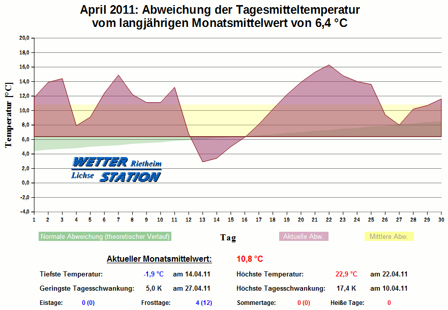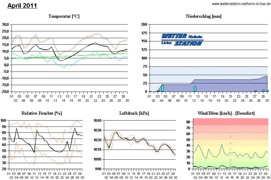 *************************************************** ************** T E M P E R A T U R ************** *************************************************** Mittlere Temperatur: 10,8 °C MIN Temperatur: -1,9 °C am 14.04.11 MAX Temperatur: 22,9 °C am 22.04.11 Mittlere MIN Temperatur: 4,8 °C Mittlere MAX Temperatur: 16,9 °C MIN Temp Delta : 5,0 K am 27.04.11 MAX Temp Delta : 17,4 K am 10.04.11 Mittl. Temp Delta: 12,1 K Starkfrosttage : 0 Eistage : 0 Frosttage : 4 Sommertage : 0 Heiße Tage : 0 *************************************************** ************ N I E D E R S C H L A G ************ *************************************************** Ges. Niederschlagsmenge: 46,7 mm MAX Niederschlag/Stunde: 5,6 mm am 04.04.11 MAX Niederschlag/Tag: 18,0 mm am 04.04.11 MAX Niederschlag in 24h: 20,6 mm am 04.04.11 MAX Niederschlag Rate: 56,4 mm/h am 29.04.11 Niederschlag an 7 Tagen Regentage (> 1mm) : 6 Regentage (> 3mm) : 4 Regentage (> 10mm) : 2 Regentage (> 20mm) : 0 *************************************************** ******************** W I N D ******************** *************************************************** Mittlere Windgeschwindigkeit: 0,8 m/s = 3,0 km/h Effektive Windrichtung: NO Maximale Windgeschwindigkeit: 11,6 m/s = 41,8 km/h aus WSW am 03.04.11 Prozentuale Verteilung Windgeschwindigkeit: Bft_0 (bis 0,9 km/h) : 40.56 % Bft_1 (bis 5,6 km/h) : 37.06 % Bft_2 (bis 12 km/h) : 20.52 % Bft_3 (bis 20 km/h) : 1.85 % Bft_4 (bis 29 km/h) : 0.01 % Prozentuale Verteilung Windrichtung: N : 21.5 % NNO : 3.3 % NO : 6.7 % ONO : 2.1 % O : 6.6 % OSO : 19.1 % SO : 9.2 % SSO : 1.3 % S : 0.5 % SSW : 2.6 % SW : 1.4 % WSW : 3.6 % W : 5.4 % WNW : 2.9 % NW : 5.9 % NNW : 7.9 % *************************************************** *************** L U F T D R U C K *************** *************************************************** Mittlerer Luftdruck: 1017,1 hPa MIN Luftdruck: 1002,2 hPa am 30.04.11 MAX Luftdruck: 1029,5 hPa am 06.04.11 *************************************************** ************ L U F T F E U C H T E ************** *************************************************** Mittlere rel. Luftfeuchte: 65,3 % MIN rel. Luftfeuchte: 27,0 % am 11.04.11 MAX rel. Luftfeuchte: 99,0 %