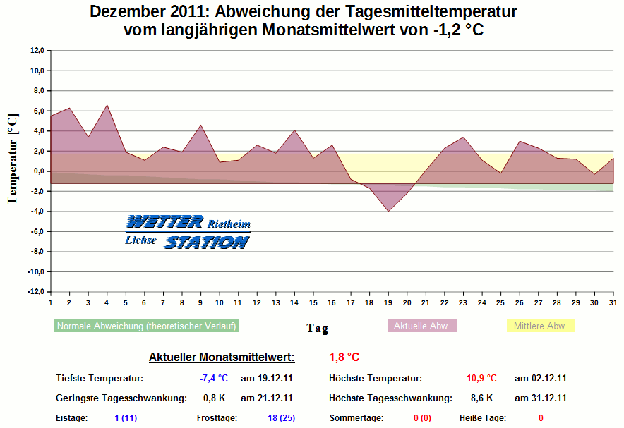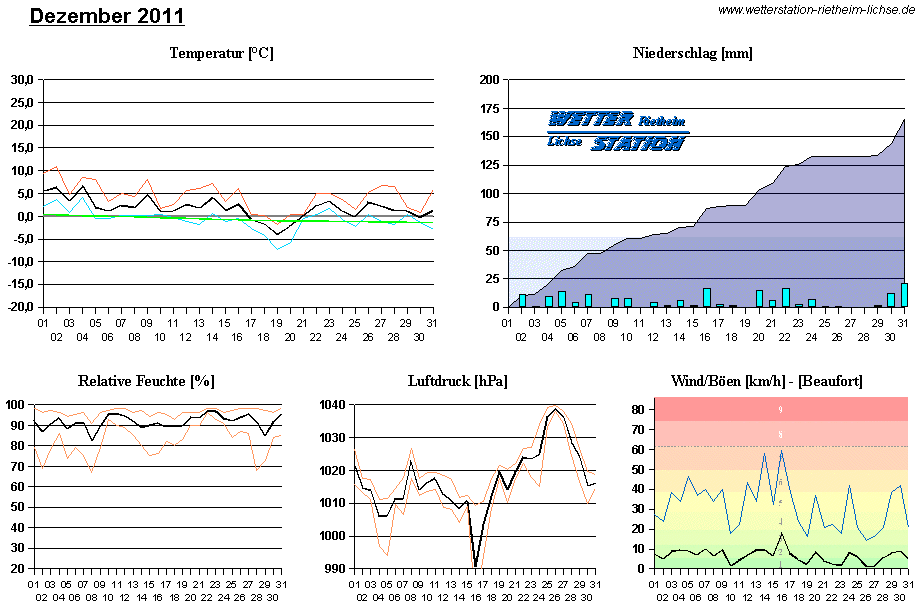 *************************************************** ************** T E M P E R A T U R ************** *************************************************** Mittlere Temperatur: 1,8 °C MIN Temperatur: -7,4 °C am 19.12.11 MAX Temperatur: 10,9 °C am 02.12.11 Mittlere MIN Temperatur: -0,7 °C Mittlere MAX Temperatur: 4,4 °C MIN Temp Delta : 0,8 K am 21.12.11 MAX Temp Delta : 8,6 K am 31.12.11 Mittl. Temp Delta: 5,1 K Starkfrosttage : 0 Eistage : 1 Frosttage : 18 Sommertage : 0 Heiße Tage : 0 *************************************************** ************ N I E D E R S C H L A G ************ *************************************************** Ges. Niederschlagsmenge: 164,8 mm MAX Niederschlag/Stunde: 5,8 mm am 07.12.11 MAX Niederschlag/Tag: 20,4 mm am 31.12.11 MAX Niederschlag in 24h: 20,4 mm am 05.12.11 MAX Niederschlag Rate: 37,8 mm/h am 05.12.11 Niederschlag an 25 Tagen Regentage (> 1mm) : 18 Regentage (> 3mm) : 16 Regentage (> 10mm) : 8 Regentage (> 20mm) : 1 *************************************************** ******************** W I N D ******************** *************************************************** Mittlere Windgeschwindigkeit: 1,8 m/s = 6,6 km/h Effektive Windrichtung: SW Maximale Windgeschwindigkeit: 16,5 m/s = 59,5 km/h aus W am 16.12.11 Prozentuale Verteilung Windgeschwindigkeit: Bft_0 (bis 0,9 km/h) : 11.39 % Bft_1 (bis 5,6 km/h) : 34.25 % Bft_2 (bis 12 km/h) : 42.67 % Bft_3 (bis 20 km/h) : 10.46 % Bft_4 (bis 29 km/h) : 0.99 % Bft_5 (bis 39 km/h) : 0.24 % Prozentuale Verteilung Windrichtung: N : 0.7 % NNO : 0.2 % NO : 0.0 % ONO : 0.0 % O : 0.2 % OSO : 0.7 % SO : 1.9 % SSO : 0.1 % S : 9.3 % SSW : 38.3 % SW : 15.0 % WSW : 16.1 % W : 6.8 % WNW : 3.1 % NW : 3.7 % NNW : 4.0 % *************************************************** *************** L U F T D R U C K *************** *************************************************** Mittlerer Luftdruck: 1016,9 hPa MIN Luftdruck: 979,0 hPa am 16.12.11 MAX Luftdruck: 1039,7 hPa am 26.12.11 *************************************************** ************ L U F T F E U C H T E ************** *************************************************** Mittlere rel. Luftfeuchte: 91,5 % MIN rel. Luftfeuchte: 67,0 % am 08.12.11 MAX rel. Luftfeuchte: 98,0 %