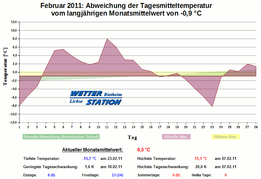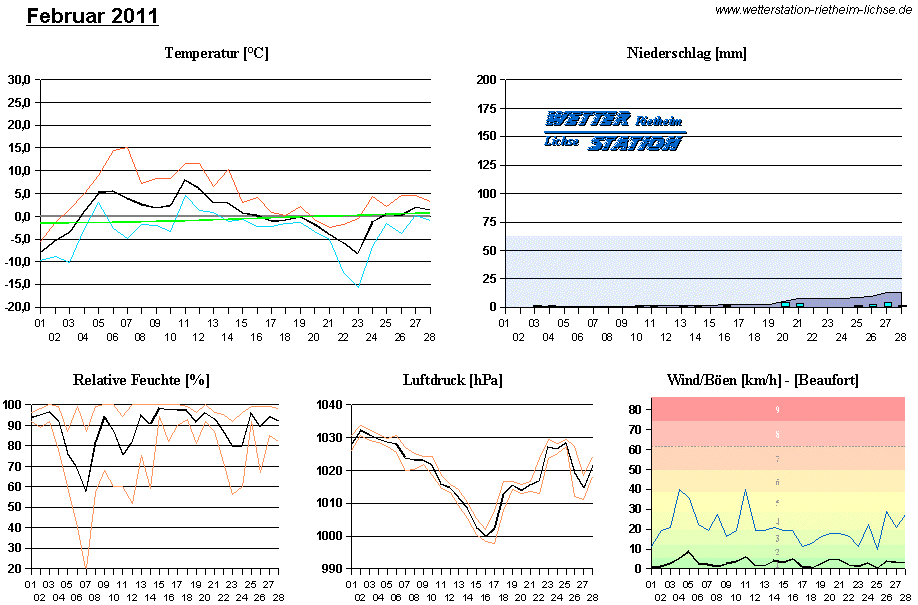 *************************************************** ************** T E M P E R A T U R ************** *************************************************** Mittlere Temperatur: 0,3 °C MIN Temperatur: -15,7 °C am 23.02.11 MAX Temperatur: 15,1 °C am 07.02.11 Mittlere MIN Temperatur: -3,4 °C Mittlere MAX Temperatur: 4,5 °C MIN Temp Delta : 1,6 K am 18.02.11 MAX Temp Delta : 20,0 K am 07.02.11 Mittl. Temp Delta: 7,9 K Starkfrosttage : 3 Eistage : 6 Frosttage : 23 Sommertage : 0 Heiße Tage : 0 *************************************************** ************ N I E D E R S C H L A G ************ *************************************************** Ges. Niederschlagsmenge: 13,5 mm MAX Niederschlag/Stunde: 1,0 mm am 26.02.11 MAX Niederschlag/Tag: 3,3 mm am 20.02.11 MAX Niederschlag in 24h: 5,1 mm am 21.02.11 MAX Niederschlag Rate: 2,8 mm/h am 27.02.11 Niederschlag an 10 Tagen Regentage (> 1mm) : 4 Regentage (> 3mm) : 2 Regentage (> 10mm) : 0 Regentage (> 20mm) : 0 *************************************************** ******************** W I N D ******************** *************************************************** Mittlere Windgeschwindigkeit: 0,8 m/s = 3,0 km/h Effektive Windrichtung: S Maximale Windgeschwindigkeit: 11,2 m/s = 40,2 km/h aus WSW am 04.02.11 Prozentuale Verteilung Windgeschwindigkeit: Bft_0 (bis 0,9 km/h) : 32.47 % Bft_1 (bis 5,6 km/h) : 47.69 % Bft_2 (bis 12 km/h) : 18.92 % Bft_3 (bis 20 km/h) : 0.92 % Prozentuale Verteilung Windrichtung: N : 4.5 % NNO : 0.9 % NO : 2.3 % ONO : 0.5 % O : 0.8 % OSO : 11.9 % SO : 21.2 % SSO : 0.8 % S : 2.0 % SSW : 25.0 % SW : 3.8 % WSW : 12.2 % W : 8.9 % WNW : 1.4 % NW : 2.5 % NNW : 1.3 % *************************************************** *************** L U F T D R U C K *************** *************************************************** Mittlerer Luftdruck: 1019,1 hPa MIN Luftdruck: 997,8 hPa am 17.02.11 MAX Luftdruck: 1033,8 hPa am 02.02.11 *************************************************** ************ L U F T F E U C H T E ************** *************************************************** Mittlere rel. Luftfeuchte: 88,3 % MIN rel. Luftfeuchte: 17,0 % am 07.02.11 MAX rel. Luftfeuchte: 100,0 %