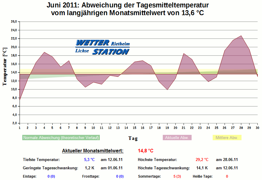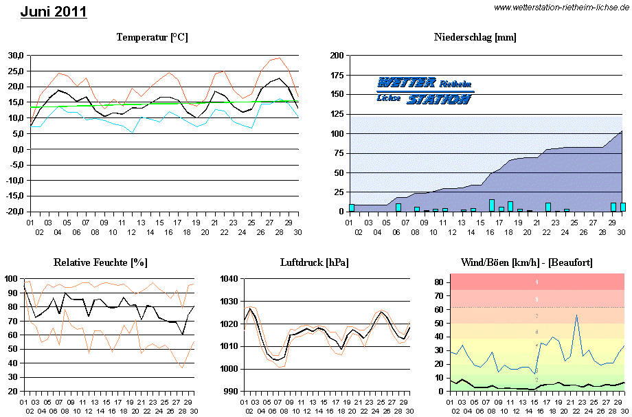 *************************************************** ************** T E M P E R A T U R ************** *************************************************** Mittlere Temperatur: 14,8 °C MIN Temperatur: 5,3 °C am 12.06.11 MAX Temperatur: 29,2 °C am 28.06.11 Mittlere MIN Temperatur: 10,2 °C Mittlere MAX Temperatur: 19,7 °C MIN Temp Delta : 1,2 K am 01.06.11 MAX Temp Delta : 14,1 K am 12.06.11 Mittl. Temp Delta: 9,6 K Starkfrosttage : 0 Eistage : 0 Frosttage : 0 Sommertage : 5 Heiße Tage : 0 *************************************************** ************ N I E D E R S C H L A G ************ *************************************************** Ges. Niederschlagsmenge: 103,4 mm MAX Niederschlag/Stunde: 9,6 mm am 18.06.11 MAX Niederschlag/Tag: 14,8 mm am 16.06.11 MAX Niederschlag in 24h: 20,8 mm am 30.06.11 MAX Niederschlag Rate: 245,2 mm/h am 18.06.11 Niederschlag an 18 Tagen Regentage (> 1mm) : 15 Regentage (> 3mm) : 10 Regentage (> 10mm) : 5 Regentage (> 20mm) : 0 *************************************************** ******************** W I N D ******************** *************************************************** Mittlere Windgeschwindigkeit: 1,2 m/s = 4,2 km/h Effektive Windrichtung: W Maximale Windgeschwindigkeit: 15,6 m/s = 56,3 km/h aus W am 22.06.11 Prozentuale Verteilung Windgeschwindigkeit: Bft_0 (bis 0,9 km/h) : 18.75 % Bft_1 (bis 5,6 km/h) : 49.90 % Bft_2 (bis 12 km/h) : 29.27 % Bft_3 (bis 20 km/h) : 2.07 % Bft_4 (bis 29 km/h) : 0.01 % Prozentuale Verteilung Windrichtung: N : 5.1 % NNO : 2.1 % NO : 5.2 % ONO : 2.3 % O : 6.9 % OSO : 12.4 % SO : 6.6 % SSO : 0.9 % S : 4.8 % SSW : 8.9 % SW : 6.3 % WSW : 8.4 % W : 6.1 % WNW : 2.8 % NW : 4.5 % NNW : 16.6 % *************************************************** *************** L U F T D R U C K *************** *************************************************** Mittlerer Luftdruck: 1015,6 hPa MIN Luftdruck: 1000,7 hPa am 07.06.11 MAX Luftdruck: 1027,7 hPa am 02.06.11 *************************************************** ************ L U F T F E U C H T E ************** *************************************************** Mittlere rel. Luftfeuchte: 79,0 % MIN rel. Luftfeuchte: 37,0 % am 28.06.11 MAX rel. Luftfeuchte: 98,0 %