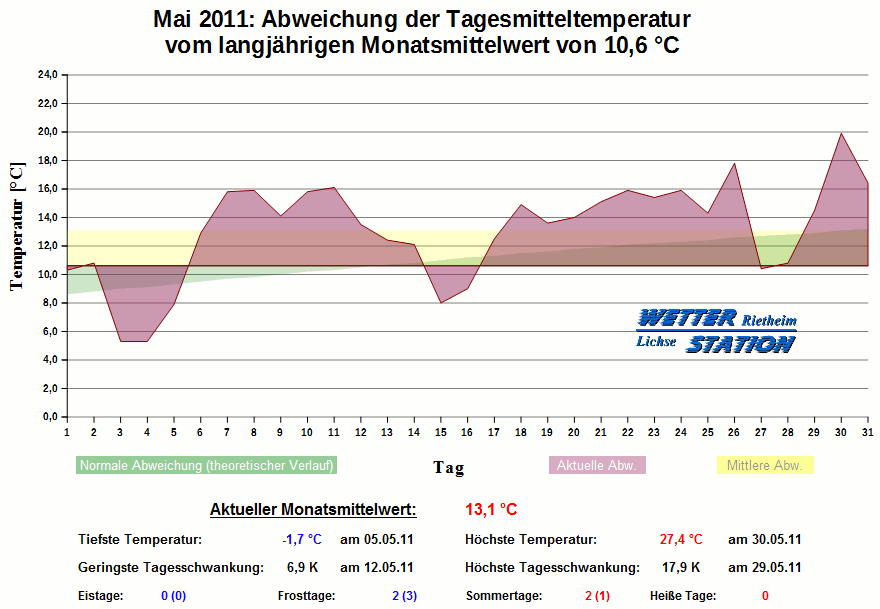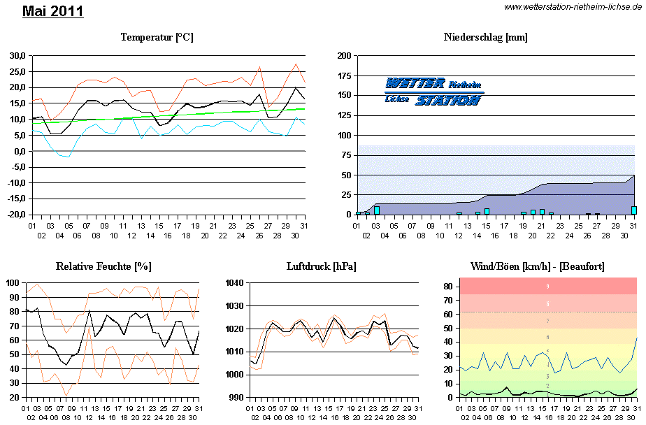 *************************************************** ************** T E M P E R A T U R ************** *************************************************** Mittlere Temperatur: 13,1 °C MIN Temperatur: -1,7 °C am 05.05.11 MAX Temperatur: 27,4 °C am 30.05.11 Mittlere MIN Temperatur: 6,4 °C Mittlere MAX Temperatur: 19,4 °C MIN Temp Delta : 6,9 K am 12.05.11 MAX Temp Delta : 17,9 K am 29.05.11 Mittl. Temp Delta: 13,0 K Starkfrosttage : 0 Eistage : 0 Frosttage : 2 Sommertage : 2 Heiße Tage : 0 *************************************************** ************ N I E D E R S C H L A G ************ *************************************************** Ges. Niederschlagsmenge: 50,3 mm MAX Niederschlag/Stunde: 4,8 mm am 21.05.11 MAX Niederschlag/Tag: 9,9 mm am 31.05.11 MAX Niederschlag in 24h: 11,2 mm am 03.05.11 MAX Niederschlag Rate: 41,4 mm/h am 15.05.11 Niederschlag an 13 Tagen Regentage (> 1mm) : 11 Regentage (> 3mm) : 5 Regentage (> 10mm) : 0 Regentage (> 20mm) : 0 *************************************************** ******************** W I N D ******************** *************************************************** Mittlere Windgeschwindigkeit: 0,8 m/s = 3,0 km/h Effektive Windrichtung: NNW Maximale Windgeschwindigkeit: 12,1 m/s = 43,5 km/h aus N am 31.05.11 Prozentuale Verteilung Windgeschwindigkeit: Bft_0 (bis 0,9 km/h) : 36.35 % Bft_1 (bis 5,6 km/h) : 42.78 % Bft_2 (bis 12 km/h) : 19.27 % Bft_3 (bis 20 km/h) : 1.61 % Prozentuale Verteilung Windrichtung: N : 21.2 % NNO : 2.0 % NO : 3.0 % ONO : 0.8 % O : 2.8 % OSO : 10.2 % SO : 11.3 % SSO : 4.3 % S : 3.5 % SSW : 7.7 % SW : 4.0 % WSW : 4.9 % W : 6.9 % WNW : 2.5 % NW : 6.0 % NNW : 9.0 % *************************************************** *************** L U F T D R U C K *************** *************************************************** Mittlerer Luftdruck: 1017,6 hPa MIN Luftdruck: 1002,4 hPa am 02.05.11 MAX Luftdruck: 1026,7 hPa am 25.05.11 *************************************************** ************ L U F T F E U C H T E ************** *************************************************** Mittlere rel. Luftfeuchte: 66,1 % MIN rel. Luftfeuchte: 21,0 % am 08.05.11 MAX rel. Luftfeuchte: 99,0 %