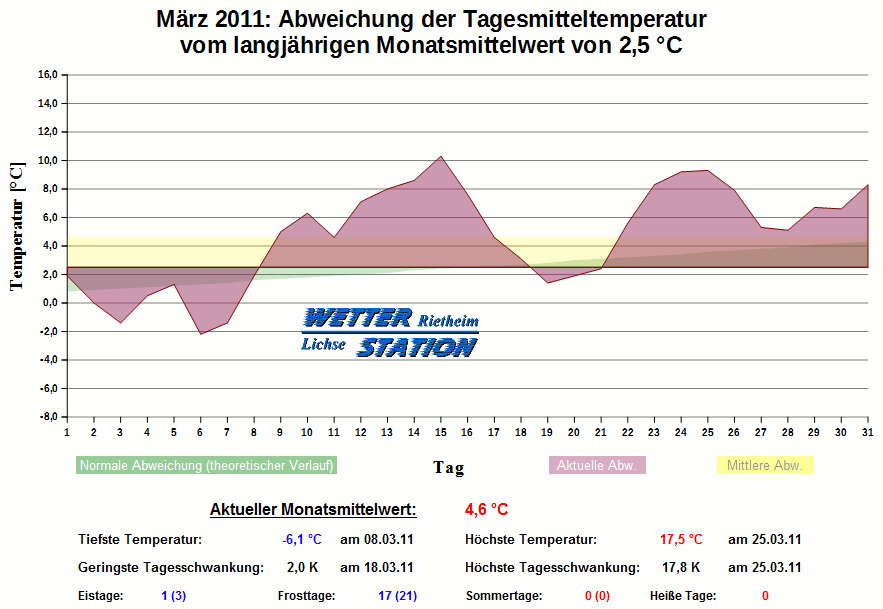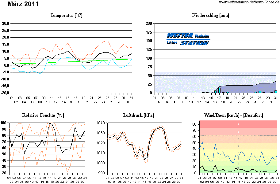 *************************************************** ************** T E M P E R A T U R ************** *************************************************** Mittlere Temperatur: 4,6 °C MIN Temperatur: -6,1 °C am 08.03.11 MAX Temperatur: 17,5 °C am 25.03.11 Mittlere MIN Temperatur: -0,0 °C Mittlere MAX Temperatur: 9,9 °C MIN Temp Delta : 2,0 K am 18.03.11 MAX Temp Delta : 17,8 K am 25.03.11 Mittl. Temp Delta: 9,9 K Starkfrosttage : 0 Eistage : 1 Frosttage : 17 Sommertage : 0 Heiße Tage : 0 *************************************************** ************ N I E D E R S C H L A G ************ *************************************************** Ges. Niederschlagsmenge: 34,5 mm MAX Niederschlag/Stunde: 2,5 mm am 17.03.11 MAX Niederschlag/Tag: 13,2 mm am 17.03.11 MAX Niederschlag in 24h: 13,5 mm am 18.03.11 MAX Niederschlag Rate: 7,4 mm/h am 17.03.11 Niederschlag an 10 Tagen Regentage (> 1mm) : 6 Regentage (> 3mm) : 4 Regentage (> 10mm) : 1 Regentage (> 20mm) : 0 *************************************************** ******************** W I N D ******************** *************************************************** Mittlere Windgeschwindigkeit: 1,2 m/s = 4,1 km/h Effektive Windrichtung: O Maximale Windgeschwindigkeit: 14,3 m/s = 51,5 km/h aus SO am 02.03.11 Prozentuale Verteilung Windgeschwindigkeit: Bft_0 (bis 0,9 km/h) : 31.39 % Bft_1 (bis 5,6 km/h) : 37.36 % Bft_2 (bis 12 km/h) : 24.99 % Bft_3 (bis 20 km/h) : 5.93 % Bft_4 (bis 29 km/h) : 0.33 % Prozentuale Verteilung Windrichtung: N : 9.3 % NNO : 2.4 % NO : 10.0 % ONO : 3.0 % O : 14.3 % OSO : 25.2 % SO : 8.1 % SSO : 0.3 % S : 0.5 % SSW : 6.2 % SW : 1.7 % WSW : 5.7 % W : 5.5 % WNW : 1.2 % NW : 3.1 % NNW : 3.5 % *************************************************** *************** L U F T D R U C K *************** *************************************************** Mittlerer Luftdruck: 1020,9 hPa MIN Luftdruck: 999,8 hPa am 17.03.11 MAX Luftdruck: 1037,0 hPa am 23.03.11 *************************************************** ************ L U F T F E U C H T E ************** *************************************************** Mittlere rel. Luftfeuchte: 72,4 % MIN rel. Luftfeuchte: 21,0 % am 24.03.11 MAX rel. Luftfeuchte: 100,0 %