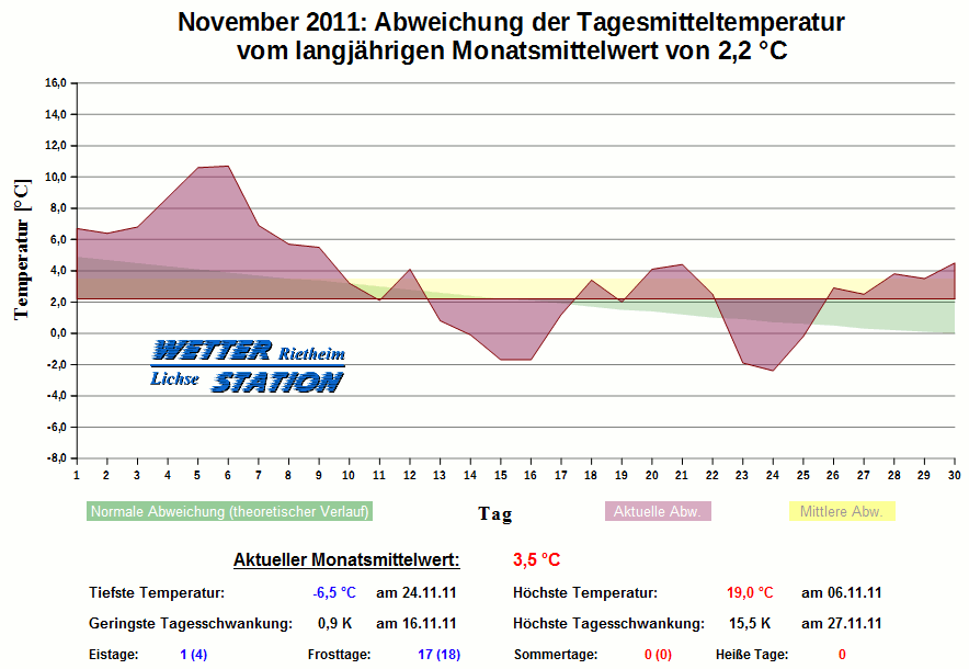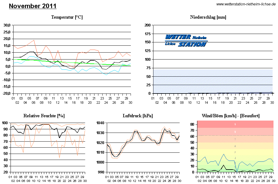*************************************************** ************** T E M P E R A T U R ************** *************************************************** Mittlere Temperatur: 3,5 °C MIN Temperatur: -6,5 °C am 24.11.11 MAX Temperatur: 19,0 °C am 06.11.11 Mittlere MIN Temperatur: -0,3 °C Mittlere MAX Temperatur: 9,2 °C MIN Temp Delta : 0,9 K am 16.11.11 MAX Temp Delta : 15,5 K am 27.11.11 Mittl. Temp Delta: 9,5 K Starkfrosttage : 0 Eistage : 1 Frosttage : 17 Sommertage : 0 Heiße Tage : 0 *************************************************** ************ N I E D E R S C H L A G ************ *************************************************** Ges. Niederschlagsmenge: 4,6 mm MAX Niederschlag/Stunde: 0,6 mm am 30.11.11 MAX Niederschlag/Tag: 1,0 mm am 30.11.11 MAX Niederschlag in 24h: 1,0 mm am 30.11.11 MAX Niederschlag Rate: 1,0 mm/h am 30.11.11 Niederschlag an 1 Tag Regentage (> 1mm) : 0 Regentage (> 3mm) : 0 Regentage (> 10mm) : 0 Regentage (> 20mm) : 0 *************************************************** ******************** W I N D ******************** *************************************************** Mittlere Windgeschwindigkeit: 0,9 m/s = 3,4 km/h Effektive Windrichtung: SSO Maximale Windgeschwindigkeit: 8,5 m/s = 30,6 km/h aus OSO am 11.11.11 Prozentuale Verteilung Windgeschwindigkeit: Bft_0 (bis 0,9 km/h) : 29.85 % Bft_1 (bis 5,6 km/h) : 47.49 % Bft_2 (bis 12 km/h) : 20.43 % Bft_3 (bis 20 km/h) : 2.22 % Bft_4 (bis 29 km/h) : 0.01 % Prozentuale Verteilung Windrichtung: N : 1.1 % NNO : 0.9 % NO : 0.8 % ONO : 0.1 % O : 1.0 % OSO : 21.8 % SO : 21.3 % SSO : 1.4 % S : 12.5 % SSW : 30.1 % SW : 4.6 % WSW : 1.2 % W : 1.0 % WNW : 0.4 % NW : 0.6 % NNW : 1.3 % *************************************************** *************** L U F T D R U C K *************** *************************************************** Mittlerer Luftdruck: 1021,8 hPa MIN Luftdruck: 1003,8 hPa am 05.11.11 MAX Luftdruck: 1036,0 hPa am 24.11.11 *************************************************** ************ L U F T F E U C H T E ************** *************************************************** Mittlere rel. Luftfeuchte: 90,8 % MIN rel. Luftfeuchte: 43,0 % am 20.11.11 MAX rel. Luftfeuchte: 99,0 %