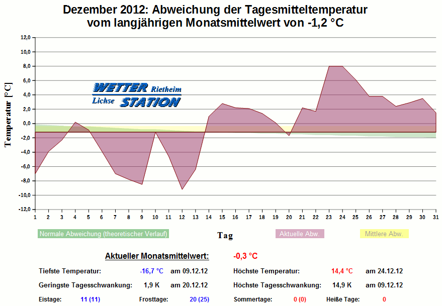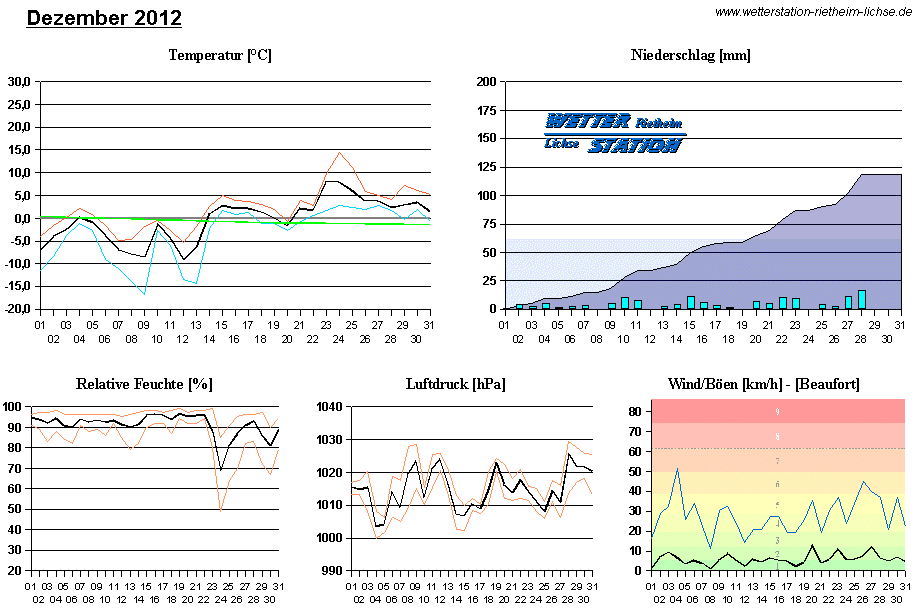 *************************************************** ************** T E M P E R A T U R ************** *************************************************** Mittlere Temperatur: -0,3 °C MIN Temperatur: -16,7 °C am 09.12.12 MAX Temperatur: 14,4 °C am 24.12.12 Mittlere MIN Temperatur: -3,3 °C Mittlere MAX Temperatur: 2,3 °C MIN Temp Delta : 1,9 K am 20.12.12 MAX Temp Delta : 14,9 K am 09.12.12 Mittl. Temp Delta: 5,6 K Starkfrosttage : 6 Eistage : 11 Frosttage : 20 Sommertage : 0 Heiße Tage : 0 *************************************************** ************ N I E D E R S C H L A G ************ *************************************************** Ges. Niederschlagsmenge: 118,6 mm MAX Niederschlag/Stunde: 3,4 mm am 23.12.12 MAX Niederschlag/Tag: 16,0 mm am 28.12.12 MAX Niederschlag in 24h: 26,2 mm am 28.12.12 MAX Niederschlag Rate: 15,4 mm/h am 27.12.12 Niederschlag an 23 Tagen Regentage (> 1mm) : 21 Regentage (> 3mm) : 15 Regentage (> 10mm) : 3 Regentage (> 20mm) : 0 *************************************************** ******************** W I N D ******************** *************************************************** Mittlere Windgeschwindigkeit: 1,6 m/s = 5,8 km/h Effektive Windrichtung: SSW Maximale Windgeschwindigkeit: 14,3 m/s = 51,5 km/h aus NW am 04.12.12 Prozentuale Verteilung Windgeschwindigkeit: Bft_0 (bis 0,9 km/h) : 13.40 % Bft_1 (bis 5,6 km/h) : 38.46 % Bft_2 (bis 12 km/h) : 39.74 % Bft_3 (bis 20 km/h) : 7.93 % Bft_4 (bis 29 km/h) : 0.46 % Bft_5 (bis 39 km/h) : 0.01 % Prozentuale Verteilung Windrichtung: N : 0.9 % NNO : 0.1 % NO : 0.0 % ONO : 0.0 % O : 0.3 % OSO : 6.7 % SO : 4.1 % SSO : 0.4 % S : 9.5 % SSW : 40.0 % SW : 11.8 % WSW : 12.4 % W : 4.1 % WNW : 1.9 % NW : 3.8 % NNW : 4.0 % *************************************************** *************** L U F T D R U C K *************** *************************************************** Mittlerer Luftdruck: 1014,8 hPa MIN Luftdruck: 999,9 hPa am 04.12.12 MAX Luftdruck: 1029,4 hPa am 28.12.12 *************************************************** ************ L U F T F E U C H T E ************** *************************************************** Mittlere rel. Luftfeuchte: 91,1 % MIN rel. Luftfeuchte: 49,0 % am 24.12.12 MAX rel. Luftfeuchte: 99,0 %
