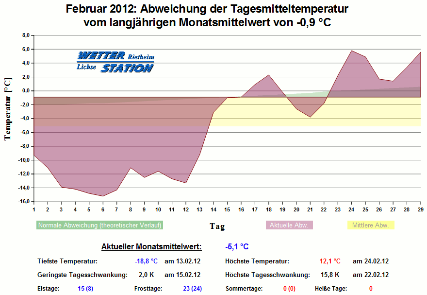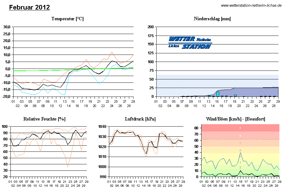 *************************************************** ************** T E M P E R A T U R ************** *************************************************** Mittlere Temperatur: -5,1 °C MIN Temperatur: -18,8 °C am 13.02.12 MAX Temperatur: 12,1 °C am 24.02.12 Mittlere MIN Temperatur: -8,5 °C Mittlere MAX Temperatur: -1,3 °C MIN Temp Delta : 2,0 K am 15.02.12 MAX Temp Delta : 15,8 K am 22.02.12 Mittl. Temp Delta: 7,2 K Starkfrosttage : 14 Eistage : 15 Frosttage : 23 Sommertage : 0 Heiße Tage : 0 *************************************************** ************ N I E D E R S C H L A G ************ *************************************************** Ges. Niederschlagsmenge: 27,0 mm MAX Niederschlag/Stunde: 2,4 mm am 15.02.12 MAX Niederschlag/Tag: 12,8 mm am 15.02.12 MAX Niederschlag in 24h: 13,4 mm am 16.02.12 MAX Niederschlag Rate: 4,8 mm/h am 15.02.12 Niederschlag an 15 Tagen Regentage (> 1mm) : 5 Regentage (> 3mm) : 2 Regentage (> 10mm) : 1 Regentage (> 20mm) : 0 *************************************************** ******************** W I N D ******************** *************************************************** Mittlere Windgeschwindigkeit: 1,0 m/s = 3,7 km/h Effektive Windrichtung: N Maximale Windgeschwindigkeit: 11,2 m/s = 40,2 km/h aus W am 15.02.12 Prozentuale Verteilung Windgeschwindigkeit: Bft_0 (bis 0,9 km/h) : 25.50 % Bft_1 (bis 5,6 km/h) : 47.27 % Bft_2 (bis 12 km/h) : 25.42 % Bft_3 (bis 20 km/h) : 1.81 % Prozentuale Verteilung Windrichtung: N : 6.4 % NNO : 7.1 % NO : 18.6 % ONO : 5.0 % O : 6.9 % OSO : 4.2 % SO : 1.5 % SSO : 0.3 % S : 1.5 % SSW : 5.1 % SW : 7.0 % WSW : 10.3 % W : 3.7 % WNW : 3.0 % NW : 5.3 % NNW : 14.2 % *************************************************** *************** L U F T D R U C K *************** *************************************************** Mittlerer Luftdruck: 1027,7 hPa MIN Luftdruck: 1009,7 hPa am 15.02.12 MAX Luftdruck: 1037,1 hPa am 04.02.12 *************************************************** ************ L U F T F E U C H T E ************** *************************************************** Mittlere rel. Luftfeuchte: 83,9 % MIN rel. Luftfeuchte: 36,0 % am 22.02.12 MAX rel. Luftfeuchte: 98,0 %