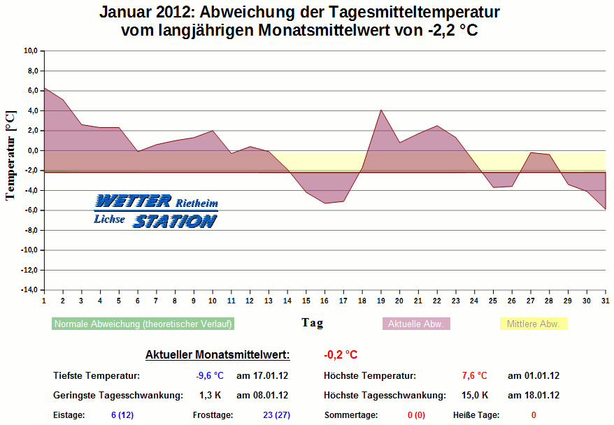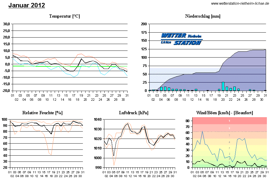 *************************************************** ************** T E M P E R A T U R ************** *************************************************** Mittlere Temperatur: -0,2 °C MIN Temperatur: -9,6 °C am 17.01.12 MAX Temperatur: 7,6 °C am 01.01.12 Mittlere MIN Temperatur: -2,9 °C Mittlere MAX Temperatur: 2,6 °C MIN Temp Delta : 1,3 K am 08.01.12 MAX Temp Delta : 15,0 K am 18.01.12 Mittl. Temp Delta: 5,6 K Starkfrosttage : 0 Eistage : 6 Frosttage : 23 Sommertage : 0 Heiße Tage : 0 *************************************************** ************ N I E D E R S C H L A G ************ *************************************************** Ges. Niederschlagsmenge: 122,6 mm MAX Niederschlag/Stunde: 6,0 mm am 21.01.12 MAX Niederschlag/Tag: 25,0 mm am 20.01.12 MAX Niederschlag in 24h: 25,0 mm am 20.01.12 MAX Niederschlag Rate: 19,0 mm/h am 04.01.12 Niederschlag an 21 Tagen Regentage (> 1mm) : 18 Regentage (> 3mm) : 14 Regentage (> 10mm) : 5 Regentage (> 20mm) : 1 *************************************************** ******************** W I N D ******************** *************************************************** Mittlere Windgeschwindigkeit: 1,5 m/s = 5,5 km/h Effektive Windrichtung: WSW Maximale Windgeschwindigkeit: 17,4 m/s = 62,8 km/h aus SW am 05.01.12 Prozentuale Verteilung Windgeschwindigkeit: Bft_0 (bis 0,9 km/h) : 18.47 % Bft_1 (bis 5,6 km/h) : 38.10 % Bft_2 (bis 12 km/h) : 33.55 % Bft_3 (bis 20 km/h) : 9.42 % Bft_4 (bis 29 km/h) : 0.46 % Prozentuale Verteilung Windrichtung: N : 2.0 % NNO : 1.5 % NO : 2.0 % ONO : 0.7 % O : 0.8 % OSO : 3.9 % SO : 6.0 % SSO : 0.4 % S : 4.5 % SSW : 16.4 % SW : 15.6 % WSW : 17.2 % W : 9.6 % WNW : 5.3 % NW : 7.3 % NNW : 7.0 % *************************************************** *************** L U F T D R U C K *************** *************************************************** Mittlerer Luftdruck: 1022,4 hPa MIN Luftdruck: 992,4 hPa am 05.01.12 MAX Luftdruck: 1036,6 hPa am 11.01.12 *************************************************** ************ L U F T F E U C H T E ************** *************************************************** Mittlere rel. Luftfeuchte: 91,2 % MIN rel. Luftfeuchte: 41,0 % am 18.01.12 MAX rel. Luftfeuchte: 98,0 %