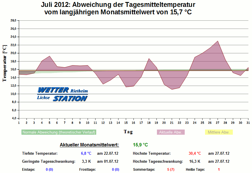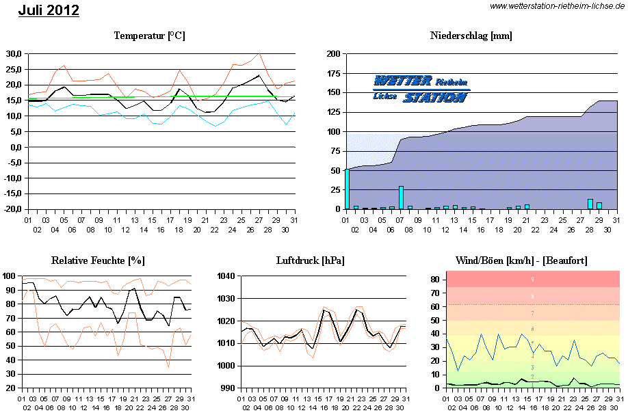 *************************************************** ************** T E M P E R A T U R ************** *************************************************** Mittlere Temperatur: 15,9 °C MIN Temperatur: 6,8 °C am 22.07.12 MAX Temperatur: 30,4 °C am 27.07.12 Mittlere MIN Temperatur: 11,2 °C Mittlere MAX Temperatur: 20,7 °C MIN Temp Delta : 3,3 K am 01.07.12 MAX Temp Delta : 16,3 K am 27.07.12 Mittl. Temp Delta: 9,5 K Starkfrosttage : 0 Eistage : 0 Frosttage : 0 Sommertage : 5 Heiße Tage : 1 *************************************************** ************ N I E D E R S C H L A G ************ *************************************************** Ges. Niederschlagsmenge: 139,8 mm MAX Niederschlag/Stunde: 19,8 mm am 07.07.12 MAX Niederschlag/Tag: 51,2 mm am 01.07.12 MAX Niederschlag in 24h: 51,2 mm am 01.07.12 MAX Niederschlag Rate: 221,6 mm/h am 01.07.12 Niederschlag an 20 Tagen Regentage (> 1mm) : 18 Regentage (> 3mm) : 10 Regentage (> 10mm) : 3 Regentage (> 20mm) : 2 *************************************************** ******************** W I N D ******************** *************************************************** Mittlere Windgeschwindigkeit: 0,9 m/s = 3,4 km/h Effektive Windrichtung: WSW Maximale Windgeschwindigkeit: 11,2 m/s = 40,2 km/h aus NW am 07.07.12 Prozentuale Verteilung Windgeschwindigkeit: Bft_0 (bis 0,9 km/h) : 29.68 % Bft_1 (bis 5,6 km/h) : 46.99 % Bft_2 (bis 12 km/h) : 21.33 % Bft_3 (bis 20 km/h) : 1.99 % Bft_4 (bis 29 km/h) : 0.01 % Prozentuale Verteilung Windrichtung: N : 4.4 % NNO : 2.0 % NO : 2.2 % ONO : 1.8 % O : 5.3 % OSO : 8.5 % SO : 4.7 % SSO : 0.6 % S : 3.6 % SSW : 11.9 % SW : 10.3 % WSW : 15.5 % W : 10.1 % WNW : 3.3 % NW : 5.8 % NNW : 9.9 % *************************************************** *************** L U F T D R U C K *************** *************************************************** Mittlerer Luftdruck: 1014,8 hPa MIN Luftdruck: 1003,6 hPa am 14.07.12 MAX Luftdruck: 1026,5 hPa am 16.07.12 *************************************************** ************ L U F T F E U C H T E ************** *************************************************** Mittlere rel. Luftfeuchte: 79,7 % MIN rel. Luftfeuchte: 35,0 % am 27.07.12 MAX rel. Luftfeuchte: 98,0 %