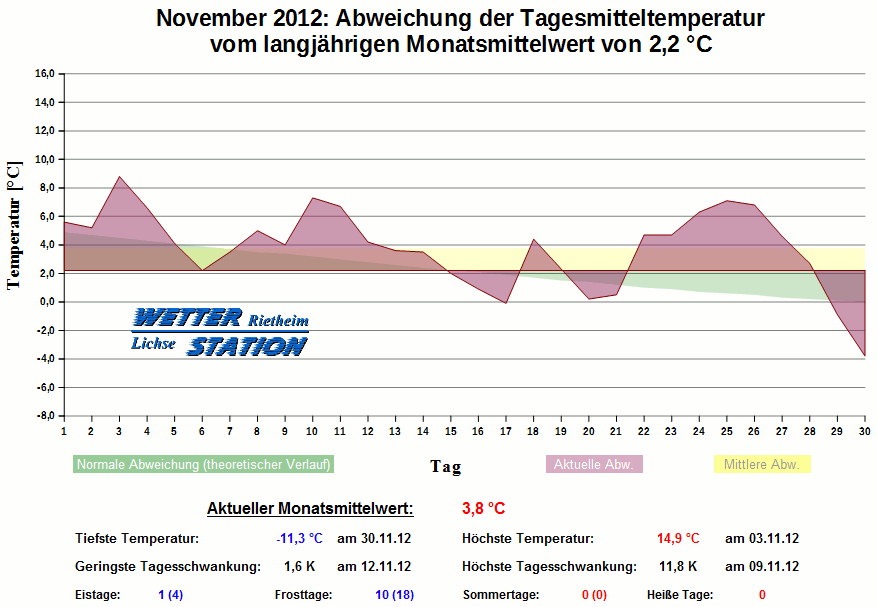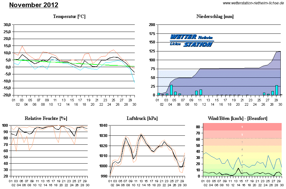 *************************************************** ************** T E M P E R A T U R ************** *************************************************** Mittlere Temperatur: 3,8 °C MIN Temperatur: -11,3 °C am 30.11.12 MAX Temperatur: 14,9 °C am 03.11.12 Mittlere MIN Temperatur: 1,1 °C Mittlere MAX Temperatur: 6,9 °C MIN Temp Delta : 1,6 K am 12.11.12 MAX Temp Delta : 11,8 K am 09.11.12 Mittl. Temp Delta: 5,8 K Starkfrosttage : 1 Eistage : 1 Frosttage : 10 Sommertage : 0 Heiße Tage : 0 *************************************************** ************ N I E D E R S C H L A G ************ *************************************************** Ges. Niederschlagsmenge: 123,8 mm MAX Niederschlag/Stunde: 3,4 mm am 04.11.12 MAX Niederschlag/Tag: 28,0 mm am 04.11.12 MAX Niederschlag in 24h: 33,6 mm am 29.11.12 MAX Niederschlag Rate: 24,2 mm/h am 05.11.12 Niederschlag an 16 Tagen Regentage (> 1mm) : 11 Regentage (> 3mm) : 10 Regentage (> 10mm) : 5 Regentage (> 20mm) : 2 *************************************************** ******************** W I N D ******************** *************************************************** Mittlere Windgeschwindigkeit: 1,3 m/s = 4,6 km/h Effektive Windrichtung: S Maximale Windgeschwindigkeit: 10,7 m/s = 38,6 km/h aus SSW am 02.11.12 Prozentuale Verteilung Windgeschwindigkeit: Bft_0 (bis 0,9 km/h) : 21.44 % Bft_1 (bis 5,6 km/h) : 42.79 % Bft_2 (bis 12 km/h) : 31.24 % Bft_3 (bis 20 km/h) : 4.50 % Bft_4 (bis 29 km/h) : 0.03 % Prozentuale Verteilung Windrichtung: N : 6.3 % NNO : 2.2 % NO : 0.5 % ONO : 0.1 % O : 0.4 % OSO : 13.4 % SO : 18.0 % SSO : 0.6 % S : 9.8 % SSW : 28.5 % SW : 9.4 % WSW : 2.9 % W : 0.8 % WNW : 0.4 % NW : 0.8 % NNW : 5.8 % *************************************************** *************** L U F T D R U C K *************** *************************************************** Mittlerer Luftdruck: 1014,1 hPa MIN Luftdruck: 990,5 hPa am 01.11.12 MAX Luftdruck: 1032,2 hPa am 13.11.12 *************************************************** ************ L U F T F E U C H T E ************** *************************************************** Mittlere rel. Luftfeuchte: 93,4 % MIN rel. Luftfeuchte: 59,0 % am 03.11.12 MAX rel. Luftfeuchte: 100,0 % %