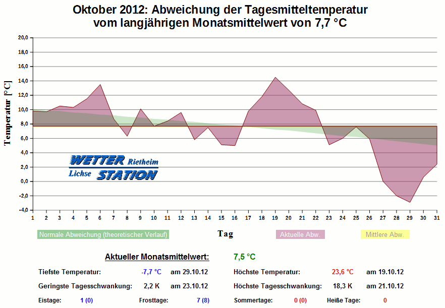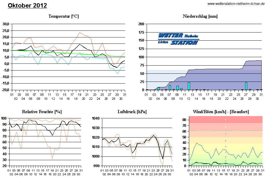 *************************************************** ************** T E M P E R A T U R ************** *************************************************** Mittlere Temperatur: 7,5 °C MIN Temperatur: -7,7 °C am 29.10.12 MAX Temperatur: 23,6 °C am 19.10.12 Mittlere MIN Temperatur: 3,1 °C Mittlere MAX Temperatur: 12,5 °C MIN Temp Delta : 2,2 K am 23.10.12 MAX Temp Delta : 18,3 K am 21.10.12 Mittl. Temp Delta: 9,3 K Starkfrosttage : 0 Eistage : 1 Frosttage : 7 Sommertage : 0 Heiße Tage : 0 *************************************************** ************ N I E D E R S C H L A G ************ *************************************************** Ges. Niederschlagsmenge: 89,6 mm MAX Niederschlag/Stunde: 12,2 mm am 12.10.12 MAX Niederschlag/Tag: 22,6 mm am 27.10.12 MAX Niederschlag in 24h: 22,6 mm am 27.10.12 MAX Niederschlag Rate: 115,2 mm/h am 12.10.12 Niederschlag an 17 Tagen Regentage (> 1mm) : 9 Regentage (> 3mm) : 6 Regentage (> 10mm) : 4 Regentage (> 20mm) : 2 *************************************************** ******************** W I N D ******************** *************************************************** Mittlere Windgeschwindigkeit: 1,1 m/s = 3,9 km/h Effektive Windrichtung: S Maximale Windgeschwindigkeit: 11,2 m/s = 40,2 km/h aus SSW am 04.10.12 Prozentuale Verteilung Windgeschwindigkeit: Bft_0 (bis 0,9 km/h) : 26.18 % Bft_1 (bis 5,6 km/h) : 44.02 % Bft_2 (bis 12 km/h) : 28.24 % Bft_3 (bis 20 km/h) : 1.57 % Prozentuale Verteilung Windrichtung: N : 5.2 % NNO : 2.9 % NO : 1.4 % ONO : 0.2 % O : 0.8 % OSO : 13.5 % SO : 16.6 % SSO : 1.2 % S : 9.1 % SSW : 31.6 % SW : 4.9 % WSW : 4.0 % W : 1.7 % WNW : 0.7 % NW : 1.4 % NNW : 4.8 % *************************************************** *************** L U F T D R U C K *************** *************************************************** Mittlerer Luftdruck: 1013,3 hPa MIN Luftdruck: 990,5 hPa am 27.10.12 MAX Luftdruck: 1023,2 hPa am 23.10.12 *************************************************** ************ L U F T F E U C H T E ************** *************************************************** Mittlere rel. Luftfeuchte: 88,8 % MIN rel. Luftfeuchte: 32,0 % am 19.10.12 MAX rel. Luftfeuchte: 99,0 %