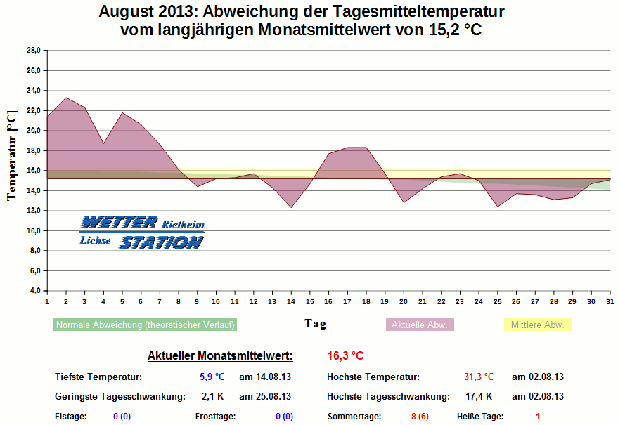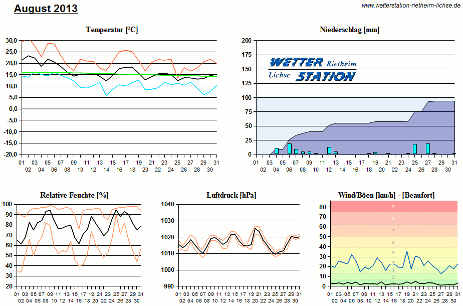 *************************************************** ************** T E M P E R A T U R ************** *************************************************** Mittlere Temperatur: 16,3 °C MIN Temperatur: 5,9 °C am 14.08.13 MAX Temperatur: 31,3 °C am 02.08.13 Mittlere MIN Temperatur: 11,2 °C Mittlere MAX Temperatur: 21,8 °C MIN Temp Delta : 2,1 K am 25.08.13 MAX Temp Delta : 17,4 K am 02.08.13 Mittl. Temp Delta: 10,6 K Starkfrosttage : 0 Eistage : 0 Frosttage : 0 Sommertage : 8 Heiße Tage : 1 *************************************************** ************ N I E D E R S C H L A G ************ *************************************************** Ges. Niederschlagsmenge: 93,8 mm MAX Niederschlag/Stunde: 11,2 mm am 06.08.13 MAX Niederschlag/Tag: 17,4 mm am 27.08.13 MAX Niederschlag in 24h: 20,2 mm am 07.08.13 MAX Niederschlag Rate: 90,8 mm/h am 06.08.13 Niederschlag an 14 Tagen Regentage (> 1mm) : 10 Regentage (> 3mm) : 9 Regentage (> 10mm) : 4 Regentage (> 20mm) : 0 *************************************************** ******************** W I N D ******************** *************************************************** Mittlere Windgeschwindigkeit: 0,8 m/s = 2,9 km/h Effektive Windrichtung: NO Maximale Windgeschwindigkeit: 9,8 m/s = 35,4 km/h aus N am 19.08.13 Prozentuale Verteilung Windgeschwindigkeit: Bft_0 (bis 0,9 km/h) : 35.50 % Bft_1 (bis 5,6 km/h) : 47.37 % Bft_2 (bis 12 km/h) : 16.06 % Bft_3 (bis 20 km/h) : 1.08 % Prozentuale Verteilung Windrichtung: N : 8.9 % NNO : 4.6 % NO : 3.5 % ONO : 1.5 % O : 4.0 % OSO : 20.1 % SO : 7.3 % SSO : 1.1 % S : 4.1 % SSW : 8.8 % SW : 2.4 % WSW : 3.7 % W : 3.4 % WNW : 2.2 % NW : 8.5 % NNW : 15.8 % *************************************************** *************** L U F T D R U C K *************** *************************************************** Mittlerer Luftdruck: 1016,6 hPa MIN Luftdruck: 1007,4 hPa am 07.08.13 MAX Luftdruck: 1026,8 hPa am 20.08.13 *************************************************** ************ L U F T F E U C H T E ************** *************************************************** Mittlere rel. Luftfeuchte: 79,1 % MIN rel. Luftfeuchte: 34,0 % am 01.08.13 MAX rel. Luftfeuchte: 99,0 %