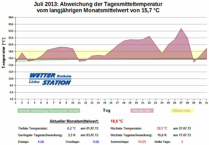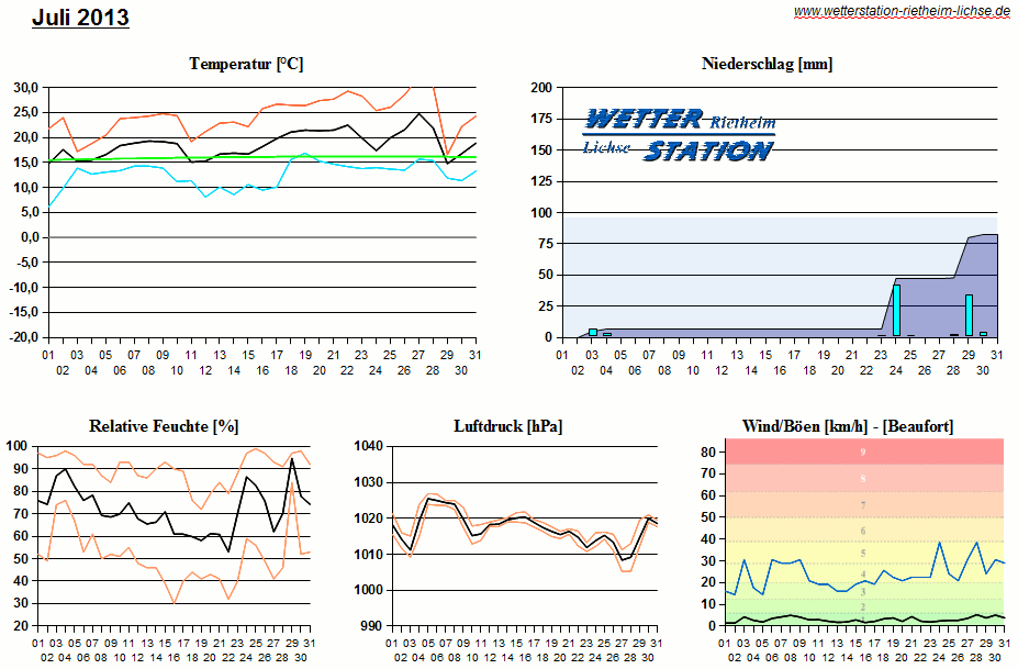 *************************************************** ************** T E M P E R A T U R ************** *************************************************** Mittlere Temperatur: 18,6 °C MIN Temperatur: 6,2 °C am 01.07.13 MAX Temperatur: 32,1 °C am 27.07.13 Mittlere MIN Temperatur: 12,6 °C Mittlere MAX Temperatur: 24,4 °C MIN Temp Delta : 3,3 K am 03.07.13 MAX Temp Delta : 16,6 K am 17.07.13 Mittl. Temp Delta: 11,8 K Starkfrosttage : 0 Eistage : 0 Frosttage : 0 Sommertage : 13 Heiße Tage : 2 *************************************************** ************ N I E D E R S C H L A G ************ *************************************************** Ges. Niederschlagsmenge: 82,0 mm MAX Niederschlag/Stunde: 30,6 mm am 24.07.13 MAX Niederschlag/Tag: 40,4 mm am 24.07.13 MAX Niederschlag in 24h: 40,6 mm am 25.07.13 MAX Niederschlag Rate: 225,8 mm/h am 24.07.13 Niederschlag an 7 Tagen Regentage (> 1mm) : 5 Regentage (> 3mm) : 3 Regentage (> 10mm) : 2 Regentage (> 20mm) : 2 *************************************************** ******************** W I N D ******************** *************************************************** Mittlere Windgeschwindigkeit: 0,9 m/s = 3,1 km/h Effektive Windrichtung: O Maximale Windgeschwindigkeit: 10,7 m/s = 38,6 km/h aus WSW am 24.07.13 Prozentuale Verteilung Windgeschwindigkeit: Bft_0 (bis 0,9 km/h) : 33.76 % Bft_1 (bis 5,6 km/h) : 45.63 % Bft_2 (bis 12 km/h) : 19.83 % Bft_3 (bis 20 km/h) : 0.78 % Prozentuale Verteilung Windrichtung: N : 6.3 % NNO : 5.4 % NO : 12.7 % ONO : 5.3 % O : 9.4 % OSO : 17.5 % SO : 5.5 % SSO : 0.8 % S : 4.0 % SSW : 10.8 % SW : 3.8 % WSW : 3.8 % W : 2.1 % WNW : 0.8 % NW : 2.6 % NNW : 9.4 % *************************************************** *************** L U F T D R U C K *************** *************************************************** Mittlerer Luftdruck: 1017,2 hPa MIN Luftdruck: 1005,2 hPa am 27.07.13 MAX Luftdruck: 1026,9 hPa am 05.07.13 *************************************************** ************ L U F T F E U C H T E ************** *************************************************** Mittlere rel. Luftfeuchte: 71,8 % MIN rel. Luftfeuchte: 30,0 % am 16.07.13 MAX rel. Luftfeuchte: 99,0 %