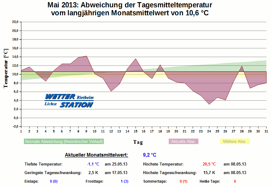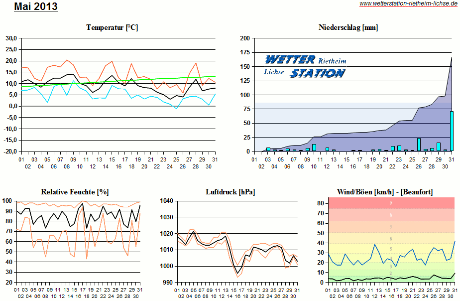 *************************************************** ************** T E M P E R A T U R ************** *************************************************** Mittlere Temperatur: 9,2 °C MIN Temperatur: -1,1 °C am 25.05.13 MAX Temperatur: 20,5 °C am 08.05.13 Mittlere MIN Temperatur: 5,1 °C Mittlere MAX Temperatur: 13,6 °C MIN Temp Delta : 2,5 K am 17.05.13 MAX Temp Delta : 15,7 K am 08.05.13 Mittl. Temp Delta: 8,5 K Starkfrosttage : 0 Eistage : 0 Frosttage : 1 Sommertage : 0 Heiße Tage : 0 *************************************************** ************ N I E D E R S C H L A G ************ *************************************************** Ges. Niederschlagsmenge: 167,2 mm MAX Niederschlag/Stunde: 7,2 mm am 31.05.13 MAX Niederschlag/Tag: 69,2 mm am 31.05.13 MAX Niederschlag in 24h: 69,2 mm am 31.05.13 MAX Niederschlag Rate: 53,0 mm/h am 09.05.13 Niederschlag an 24 Tagen Regentage (> 1mm) : 17 Regentage (> 3mm) : 11 Regentage (> 10mm) : 4 Regentage (> 20mm) : 2 *************************************************** ******************** W I N D ******************** *************************************************** Mittlere Windgeschwindigkeit: 1,2 m/s = 4,2 km/h Effektive Windrichtung: WNW Maximale Windgeschwindigkeit: 11,6 m/s = 41,8 km/h aus W am 31.05.13 Prozentuale Verteilung Windgeschwindigkeit: Bft_0 (bis 0,9 km/h) : 19.32 % Bft_1 (bis 5,6 km/h) : 49.22 % Bft_2 (bis 12 km/h) : 29.44 % Bft_3 (bis 20 km/h) : 2.03 % Prozentuale Verteilung Windrichtung: N : 9.2 % NNO : 4.2 % NO : 3.6 % ONO : 1.0 % O : 3.3 % OSO : 7.6 % SO : 4.0 % SSO : 0.5 % S : 4.5 % SSW : 9.7 % SW : 7.9 % WSW : 12.7 % W : 6.8 % WNW : 2.9 % NW : 6.9 % NNW : 15.2 % *************************************************** *************** L U F T D R U C K *************** *************************************************** Mittlerer Luftdruck: 1010,6 hPa MIN Luftdruck: 993,2 hPa am 16.05.13 MAX Luftdruck: 1022,8 hPa am 05.05.13 *************************************************** ************ L U F T F E U C H T E ************** *************************************************** Mittlere rel. Luftfeuchte: 85,1 % MIN rel. Luftfeuchte: 43,0 % am 18.05.13 MAX rel. Luftfeuchte: 100,0 %