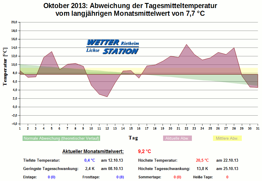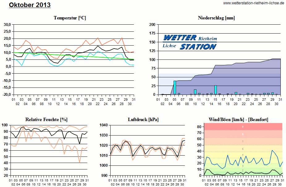 *************************************************** ************** T E M P E R A T U R ************** *************************************************** Mittlere Temperatur: 9,2 °C MIN Temperatur: 0,4 °C am 12.10.13 MAX Temperatur: 20,5 °C am 22.10.13 Mittlere MIN Temperatur: 5,9 °C Mittlere MAX Temperatur: 13,9 °C MIN Temp Delta : 2,4 K am 08.10.13 MAX Temp Delta : 13,8 K am 25.10.13 Mittl. Temp Delta: 8,0 K Starkfrosttage : 0 Eistage : 0 Frosttage : 0 Sommertage : 0 Heiße Tage : 0 *************************************************** ************ N I E D E R S C H L A G ************ *************************************************** Ges. Niederschlagsmenge: 102,6 mm MAX Niederschlag/Stunde: 15,4 mm am 05.10.13 MAX Niederschlag/Tag: 37,8 mm am 05.10.13 MAX Niederschlag in 24h: 39,4 mm am 06.10.13 MAX Niederschlag Rate: 88,6 mm/h am 05.10.13 Niederschlag an 16 Tagen Regentage (> 1mm) : 11 Regentage (> 3mm) : 5 Regentage (> 10mm) : 3 Regentage (> 20mm) : 2 *************************************************** ******************** W I N D ******************** *************************************************** Mittlere Windgeschwindigkeit: 1,2 m/s = 4,2 km/h Effektive Windrichtung: S Maximale Windgeschwindigkeit: 11,6 m/s = 41,8 km/h aus SSW am 27.10.13 Prozentuale Verteilung Windgeschwindigkeit: Bft_0 (bis 0,9 km/h) : 25.02 % Bft_1 (bis 5,6 km/h) : 43.66 % Bft_2 (bis 12 km/h) : 26.21 % Bft_3 (bis 20 km/h) : 5.10 % Bft_4 (bis 29 km/h) : 0.01 % Prozentuale Verteilung Windrichtung: N : 1.8 % NNO : 0.4 % NO : 0.6 % ONO : 0.4 % O : 0.7 % OSO : 11.9 % SO : 11.8 % SSO : 1.6 % S : 11.8 % SSW : 36.3 % SW : 7.7 % WSW : 5.8 % W : 2.7 % WNW : 0.8 % NW : 1.9 % NNW : 3.8 % *************************************************** *************** L U F T D R U C K *************** *************************************************** Mittlerer Luftdruck: 1016,7 hPa MIN Luftdruck: 1005,2 hPa am 28.10.13 MAX Luftdruck: 1027,1 hPa am 30.10.13 *************************************************** ************ L U F T F E U C H T E ************** *************************************************** Mittlere rel. Luftfeuchte: 88,6 % MIN rel. Luftfeuchte: 40,0 % am 28.10.13 MAX rel. Luftfeuchte: 99,0 %