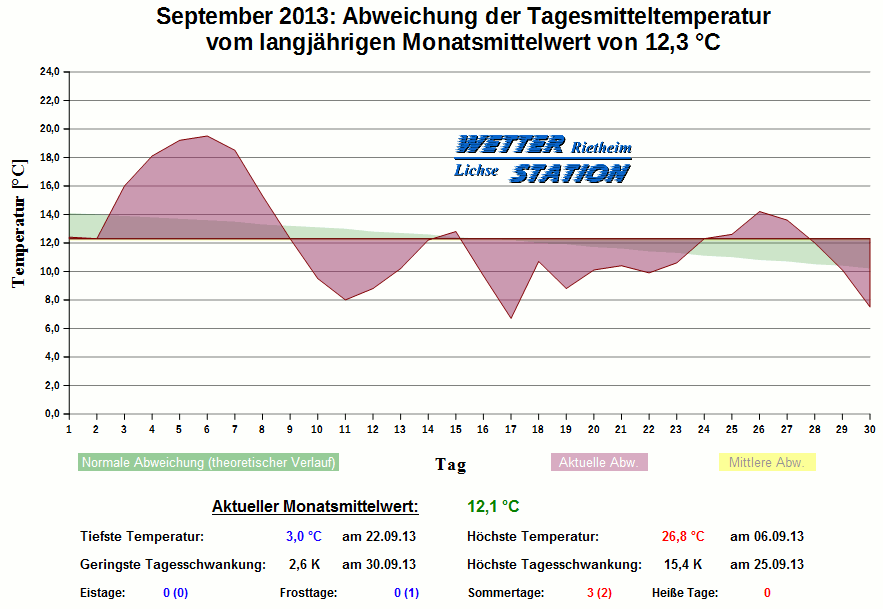 *************************************************** ************** T E M P E R A T U R ************** *************************************************** Mittlere Temperatur: 12,1 °C MIN Temperatur: 3,0 °C am 22.09.13 MAX Temperatur: 26,8 °C am 06.09.13 Mittlere MIN Temperatur: 8,1 °C Mittlere MAX Temperatur: 16,6 °C MIN Temp Delta : 2,6 K am 30.09.13 MAX Temp Delta : 15,4 K am 25.09.13 Mittl. Temp Delta: 8,5 K Starkfrosttage : 0 Eistage : 0 Frosttage : 0 Sommertage : 3 Heiße Tage : 0 *************************************************** ************ N I E D E R S C H L A G ************ *************************************************** Ges. Niederschlagsmenge: 138,2 mm MAX Niederschlag/Stunde: 16,8 mm am 08.09.13 MAX Niederschlag/Tag: 35,2 mm am 12.09.13 MAX Niederschlag in 24h: 41,0 mm am 09.09.13 MAX Niederschlag Rate: 61,0 mm/h am 08.09.13 Niederschlag an 15 Tagen Regentage (> 1mm) : 12 Regentage (> 3mm) : 10 Regentage (> 10mm) : 5 Regentage (> 20mm) : 2 *************************************************** ******************** W I N D ******************** *************************************************** Mittlere Windgeschwindigkeit: 1,0 m/s = 3,6 km/h Effektive Windrichtung: SW Maximale Windgeschwindigkeit: 11,2 m/s = 40,2 km/h aus SW am 18.09.13 Prozentuale Verteilung Windgeschwindigkeit: Bft_0 (bis 0,9 km/h) : 26.75 % Bft_1 (bis 5,6 km/h) : 47.53 % Bft_2 (bis 12 km/h) : 24.31 % Bft_3 (bis 20 km/h) : 1.41 % Prozentuale Verteilung Windrichtung: N : 5.0 % NNO : 1.5 % NO : 1.4 % ONO : 0.9 % O : 1.1 % OSO : 11.6 % SO : 10.7 % SSO : 0.6 % S : 6.0 % SSW : 18.8 % SW : 6.5 % WSW : 10.7 % W : 6.1 % WNW : 2.5 % NW : 6.2 % NNW : 10.5 % *************************************************** *************** L U F T D R U C K *************** *************************************************** Mittlerer Luftdruck: 1015,3 hPa MIN Luftdruck: 999,4 hPa am 18.09.13 MAX Luftdruck: 1028,2 hPa am 22.09.13 *************************************************** ************ L U F T F E U C H T E ************** *************************************************** Mittlere rel. Luftfeuchte: 86,5 % MIN rel. Luftfeuchte: 38,0 % am 02.09.13 MAX rel. Luftfeuchte: 100,0 %